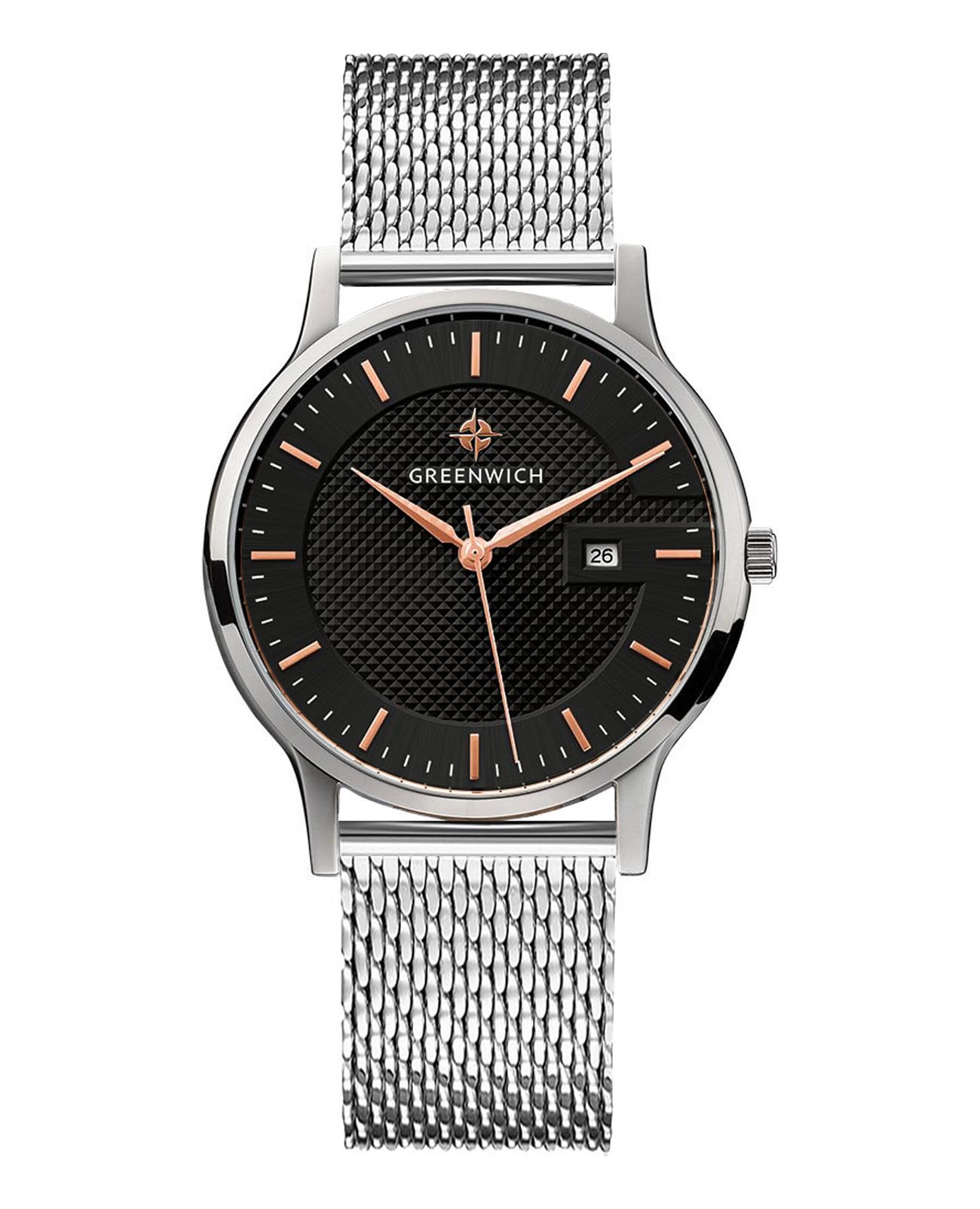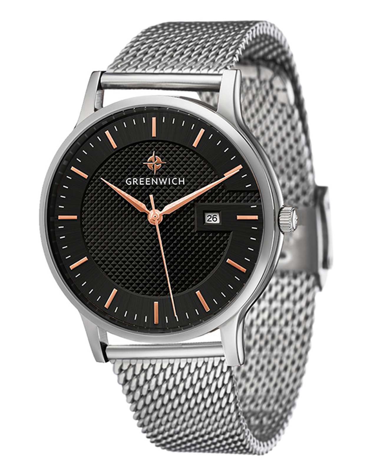Мужские английские часы с минеральным стекломМинеральное стеклоМинеральное стекло представляет собой искусственно выращенный минерал кварца. Такое стекло отличается особой устойчивостью к повреждениям и царапинам. Уступает по некоторым качествам сапфировому стеклу. Greenwich Breeze GW 031.10.35, кварцевый механизм с высокой точностью. Корпус часов изготовлен из стали. Циферблат украшен метками в виде шртихов. Окошко даты в положении 3 часа. Класс водозащиты: 50 метров, позволит защитить корпус от случайных брызг или капель дождя. Стальной браслет миланского плетения на раскладном замкеРаскладной замокДанный вариант застежки используется только на часах с металлическим браслетом. Отличительная особенность такого крепления в том, что длина браслета становится универсальной и вы можете самостоятельно отрегулировать нужный вам размер – застежка просто двигается по браслету часов..