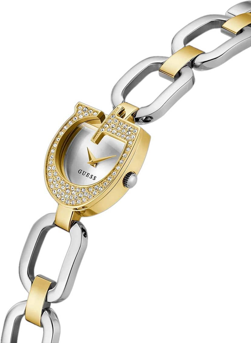 Часы Guess GW0683L6 — это изысканный аксессуар, который подчеркнет ваш стиль и индивидуальность. Часы оснащены надежным кварцевым механизмом. Корпус часов выполнен из стали с золотистым IP-покрытиемIP-покрытиеМетод ионного напыления. Демонстрирует повышенную устойчивость к истиранию, окислению и химическим веществам. Под воздействием высокого давления и температуры около 1500°C молекулы металла надёжно соединяются с частицами корпуса часов., что придает ему дополнительную прочность и устойчивость к внешним воздействиям. Изюминкой дизайна является корпус в форме буквы G, украшенный кристаллами, что добавляет изделию особый шарм и блеск. Серебристый циферблат выполнен по технологии Sunray, создающей эффект солнечных лучей, и придает часам элегантность и утонченность. Стальной браслет с частичным золотистым IP-покрытиемIP-покрытиеМетод ионного напыления. Демонстрирует повышенную устойчивость к истиранию, окислению и химическим веществам. Под воздействием высокого давления и температуры около 1500°C молекулы металла надёжно соединяются с частицами корпуса часов. и ювелирной застежкой, обеспечивая гармоничное сочетание с корпусом. Минеральное стеклоМинеральное стеклоМинеральное стекло представляет собой искусственно выращенный минерал кварца. Такое стекло отличается особой устойчивостью к повреждениям и царапинам. Уступает по некоторым качествам сапфировому стеклу. надежно защищает циферблат от царапин и других повреждений. Часы обладают водозащитой 30WR, что позволяет не беспокоиться о случайных брызгах воды. Эти часы станут великолепным дополнением к вашему гардеробу и подчеркнут вашу утонченность и любовь к деталям.