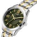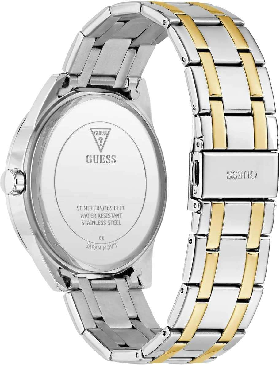 Стильные и практичные мужские наручные часы Guess GW0893G1 станут достойным дополнением к вашему образу. Эти часы оснащены надежным кварцевым механизмом, гарантирующим точность и долговечность. Круглый стальной корпус с полированной поверхностью подчеркивает элегантность и современный стиль аксессуара. Зеленый циферблат, выполненный по технологии Sunray, создает эффект солнечных лучей, добавляя глубины и изысканности. Метки в виде штрихов и римских цифр позволяют легко считывать время, а рифленая заводная головка обеспечивает удобство в использовании. Стальной браслет с частичным золотистым IP-покрытиемIP-покрытиеМетод ионного напыления. Демонстрирует повышенную устойчивость к истиранию, окислению и химическим веществам. Под воздействием высокого давления и температуры около 1500°C молекулы металла надёжно соединяются с частицами корпуса часов. и раскладной застежкойРаскладная застёжкаТакой тип застёжки используется только на браслетах из металла. Она никогда не раскрывается полностью, происходит разделение на 2 и более частей. Раскладывающая застёжка снизит вероятность потери часов к минимуму. обеспечивает комфортное прилегание к запястью и надежную фиксацию. Минеральное стеклоМинеральное стеклоМинеральное стекло представляет собой искусственно выращенный минерал кварца. Такое стекло отличается особой устойчивостью к повреждениям и царапинам. Уступает по некоторым качествам сапфировому стеклу. защищает циферблат от царапин, сохраняя его безупречный вид. Люминесцентное покрытиеЛюминесцентное покрытиеПозволяет считывать показания времени в темноте. Производители наносят на стрелки, часовые индексы, безель или поверхность циферблата светонакопительный состав, дающий холодное свечение. на стрелках обеспечивает отличную видимость в темноте. Водозащита уровня 50WR позволяет не беспокоиться о случайных брызгах и дождевых каплях, что делает эти часы идеальным выбором для активных и стильных мужчин.