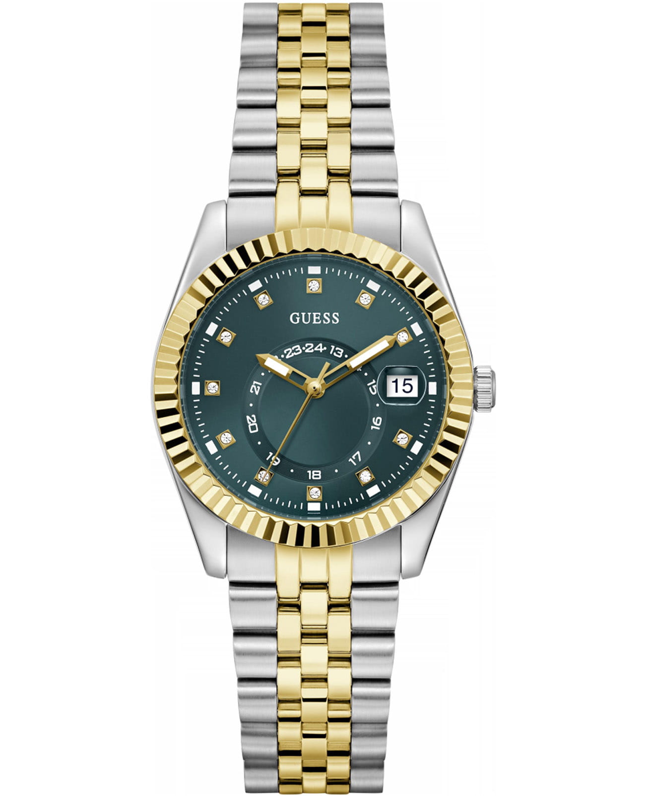 Элегантные женские наручные часы Guess GW0936L3 сочетают в себе стиль и функциональность. Эти часы оснащены точным кварцевым механизмом, что гарантирует надежность и долговечность. Корпус часов выполнен из прочной нержавеющей стали c неповоротным рифленым безелемБезельВнешний ободок, закрепляющий стекло. В спортивных часах так называется поворотное кольцо с делениями на циферблате, выполняет роль таймера – замеряет отрезки времени на шкале. Неподвижный безель – элемент декора. Однонаправленно вращающийся безель на дайверских часах позволяет фиксировать моменты погружения и выныривания на поверхность. с PVD-покрытиемPVDУльтратонкое покрытие наносится в технике вакуумного напыления, сочетает в себе нитрид титана особой прочности со слоем золота или оксида хрома. Несёт в себе декоративную или защитную функцию., придающий часам роскошный вид. Циферблат добавляет изделию утонченности и особого шарма. Часы оснащены стальным браслетом с PVD-покрытиемPVDУльтратонкое покрытие наносится в технике вакуумного напыления, сочетает в себе нитрид титана особой прочности со слоем золота или оксида хрома. Несёт в себе декоративную или защитную функцию. на раскладной застёжкеРаскладная застёжкаТакой тип застёжки используется только на браслетах из металла. Она никогда не раскрывается полностью, происходит разделение на 2 и более частей. Раскладывающая застёжка снизит вероятность потери часов к минимуму., которая обеспечивает комфортное прилегание к запястью и надежную фиксацию. Минеральное стеклоМинеральное стеклоМинеральное стекло представляет собой искусственно выращенный минерал кварца. Такое стекло отличается особой устойчивостью к повреждениям и царапинам. Уступает по некоторым качествам сапфировому стеклу. защищает циферблат от царапин и повреждений, сохраняя его безупречный вид. Водозащита 30WR гарантирует защиту от случайных брызг и дождя, что делает эти часы практичным аксессуаром для повседневной жизни. Стрелки и метки с люминесцентным покрытиемЛюминесцентное покрытиеПозволяет считывать показания времени в темноте. Производители наносят на стрелки, часовые индексы, безель или поверхность циферблата светонакопительный состав, дающий холодное свечение. обеспечивает отличную видимость в темноте. Окошко даты находится в положении 3 часа. Guess – это не просто аксессуар, это заявление о вашем безупречном вкусе и стремлении к совершенству.