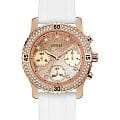 Мужские кварцевые часы c хронографомХронографФункция позволяет измерять отрезки времени с особой точностью: часы, минуты, секунды. Верным признаком хронографа является наличие на циферблате 3 дополнительных окошек-счётчиков. и минеральным стекломМинеральное стеклоМинеральное стекло представляет собой искусственно выращенный минерал кварца. Такое стекло отличается особой устойчивостью к повреждениям и царапинам. Уступает по некоторым качествам сапфировому стеклу. Guess W1098L5, кварцевый механизм с высокой точностью. Класс водозащиты: 50 метров, позволит защитить корпус от случайных брызг или капель дождя. Корпус часов изготовлен из стали. Силиконовый ремешок на стандартной застёжке. Время в 24-х часовом формате, дата и день недели вынесены на отдельные циферблаты. БезельБезельВнешний ободок, закрепляющий стекло. В спортивных часах так называется поворотное кольцо с делениями на циферблате, выполняет роль таймера – замеряет отрезки времени на шкале. Неподвижный безель – элемент декора. Однонаправленно вращающийся безель на дайверских часах позволяет фиксировать моменты погружения и выныривания на поверхность. инкрустирован кристаллами.