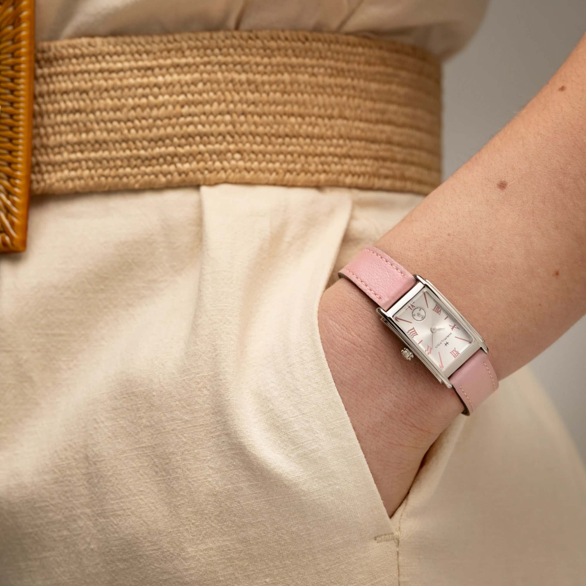Благодаря прямоугольному корпусу Ardmore Quartz олицетворяет универсальность стиля ар-деко. Вдохновленная свежестью цветущих цветов, эта модель из нержавеющей стали может похвастаться кожаным ремешком нежно-розового цвета и серебристым циферблатом sunray с римскими цифрами соответствующего цвета, подчеркивающими женственность и четкий стиль. Прочное минеральное стеклоМинеральное стеклоМинеральное стекло представляет собой искусственно выращенный минерал кварца. Такое стекло отличается особой устойчивостью к повреждениям и царапинам. Уступает по некоторым качествам сапфировому стеклу..