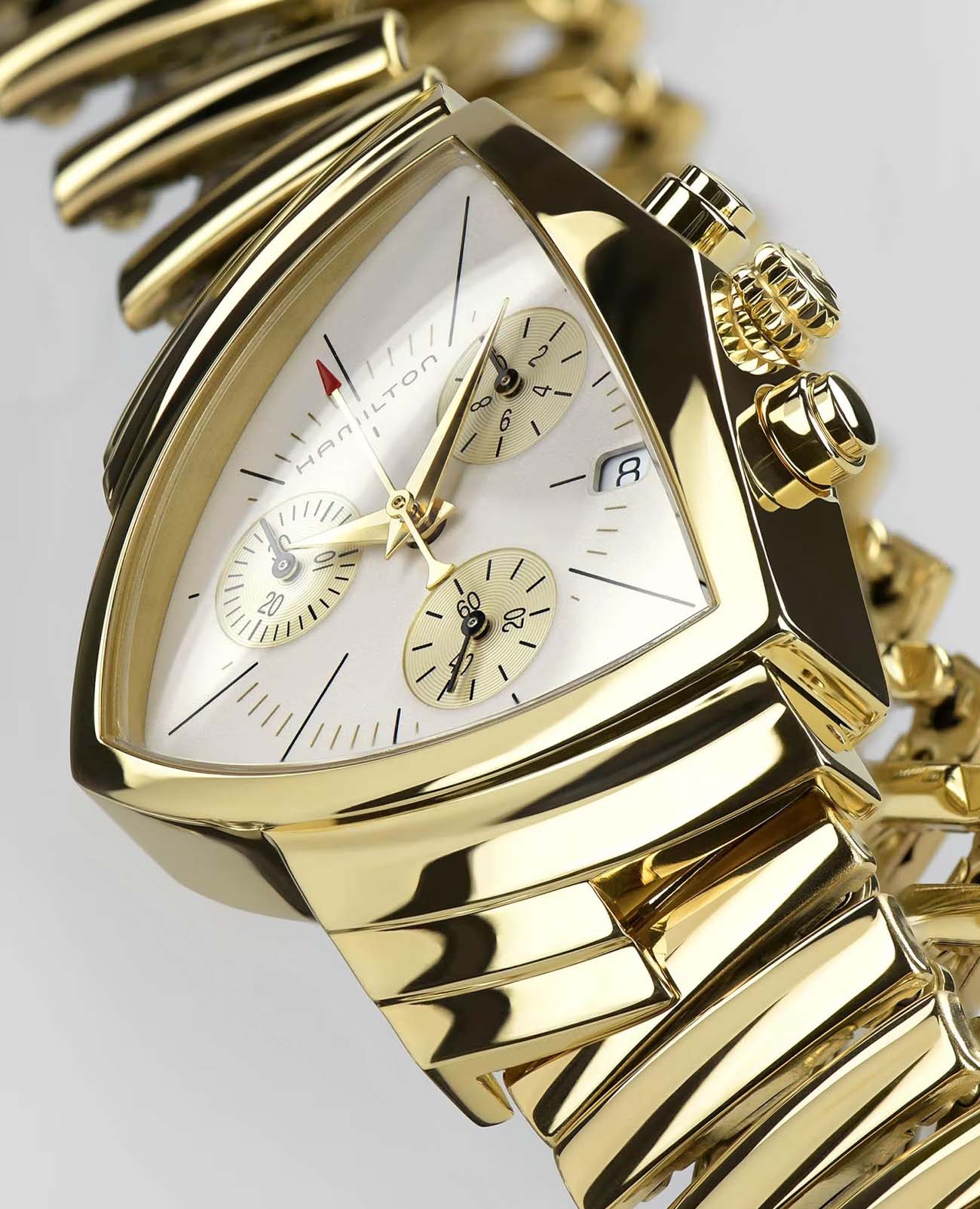Мужские кварцевые часы Hamilton Ventura Chrono Quartz H24422151 c хронографомХронографФункция позволяет измерять отрезки времени с особой точностью: часы, минуты, секунды. Верным признаком хронографа является наличие на циферблате 3 дополнительных окошек-счётчиков.. Корпус и браслет часов изготовлены из нержавеющей стали с PVD-покрытиемPVDУльтратонкое покрытие наносится в технике вакуумного напыления, сочетает в себе нитрид титана особой прочности со слоем золота или оксида хрома. Несёт в себе декоративную или защитную функцию.. Сапфировое стеклоСапфировое стеклоПрочный и надёжный материал из кристалла сапфира синтетического происхождения, характеризующийся особой твёрдостью и устойчивостью к царапинам и повреждениям. устойчивое к мелким механическим повреждениям. Окошко даты находится в положении 4 часа. Класс водозащиты: 50 метров, позволит защитить корпус от случайных брызг или капель дождя.