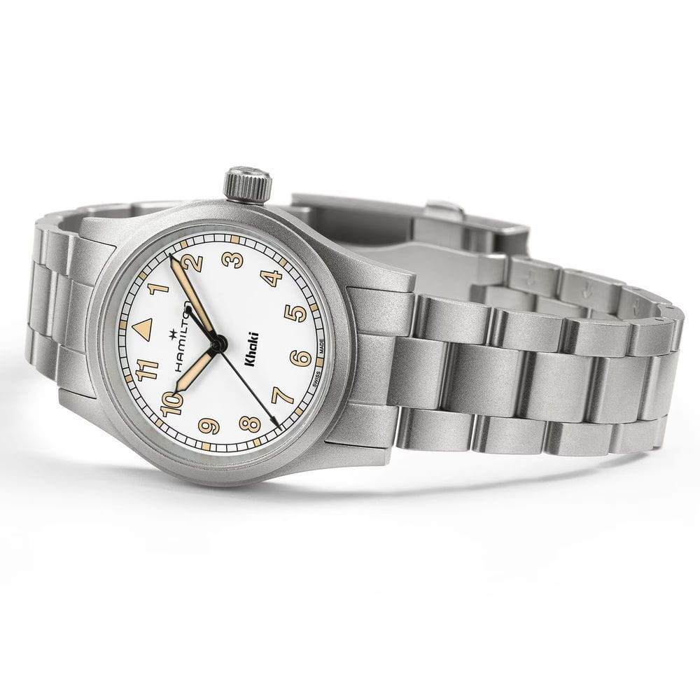Hamilton Khaki Field Quartz H69301110 — компактные и универсальные часы в классическом военном стиле, с акцентом на надёжность и практичность. Корпус диаметром 33 мм выполнен из нержавеющей стали с сатинированной поверхностью. Он лёгкий, удобный и идеально подходит для запястий любого размера. Циферблат защищён сапфировым стекломСапфировое стеклоПрочный и надёжный материал из кристалла сапфира синтетического происхождения, характеризующийся особой твёрдостью и устойчивостью к царапинам и повреждениям. с антибликовым покрытиемАнтибликовое покрытиеСлой оксида металла в 0,13-0,3 микрон, благодаря которому стекло часов не бликует и не отражает свет. Антибликовое покрытие уменьшает отражение света в 10 раз, обеспечивая отличную читаемость показателей циферблата., устойчивым к царапинам и бликам. Циферблат оформлен в классическом армейском стиле: крупные арабские цифры, 24-часовая шкала по внутреннему кругу, стрелки и метки с люминесцентным покрытиемЛюминесцентное покрытиеПозволяет считывать показания времени в темноте. Производители наносят на стрелки, часовые индексы, безель или поверхность циферблата светонакопительный состав, дающий холодное свечение. для удобного считывания в темноте. Внутри установлен швейцарский кварцевый калибр ETA F05.105mh2 с функцией EOL-индикацииEOLПредставляет собой систему, уведомляющую владельца часов о необходимости замены элемента питания. За 2 недели до полного разряда батарейки секундная стрелка перестаёт ходить чётко и начинает перепрыгивать на 3-4 деления. — предупреждением о скором разряде батареи. Модель укомплектована браслетом из нержавеющей стали с раскладной застёжкойРаскладная застёжкаТакой тип застёжки используется только на браслетах из металла. Она никогда не раскрывается полностью, происходит разделение на 2 и более частей. Раскладывающая застёжка снизит вероятность потери часов к минимуму., обеспечивающей надёжную посадку. Водонепроницаемость 50 метров делает часы устойчивыми к брызгам и дождю, идеально подходящими для повседневного ношения. Khaki Field Quartz 33 мм — надёжный выбор для тех, кто ценит простоту, точность и долговечность.