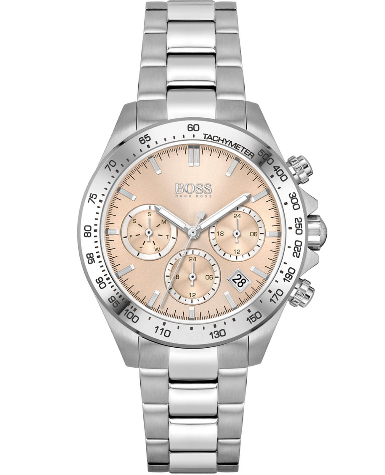 Элегантные женские часы Hugo Boss HB1502615 из коллекции Novia Sport Lux представлены в стальном корпусе диаметром 38 мм с эффектным розовым цифербалтом в технике Sunray, защищённым прочным минеральным стекломМинеральное стеклоМинеральное стекло представляет собой искусственно выращенный минерал кварца. Такое стекло отличается особой устойчивостью к повреждениям и царапинам. Уступает по некоторым качествам сапфировому стеклу.. Модель оснащена швейцарским кварцевым механизмом с полезными функциями: индикацией даты между 4 и 5 часами, вторым часовым поясомВторой часовой поясФункция, позволяющая отображать время двух часовых поясов одновременно. в 24-часовом формате и тахиметрической шкалойТахиметрРазмеченная шкала, располагается на ободке или безеле часов. Тахиметр позволяет рассчитать скорость на определённом участке пути, расстояние измеряется в километрах или милях.. Спортивный характер подчёркивает рифлёная заводная головка с защитой, а стальной браслет с раскладывающейся застёжкой обеспечивает комфортную посадку. Ударопрочная конструкцияУдаропрочный корпусМеханизм заключён в корпус, выполненный из современных материалов, устойчивых к ударам, механическим повреждениям и падению с высоты: инновационный пластик, карбон, нержавеющая сталь, титан. с водонепроницаемостью 50 метров делает часы устойчивыми к повседневным нагрузкам.