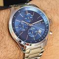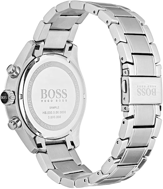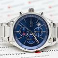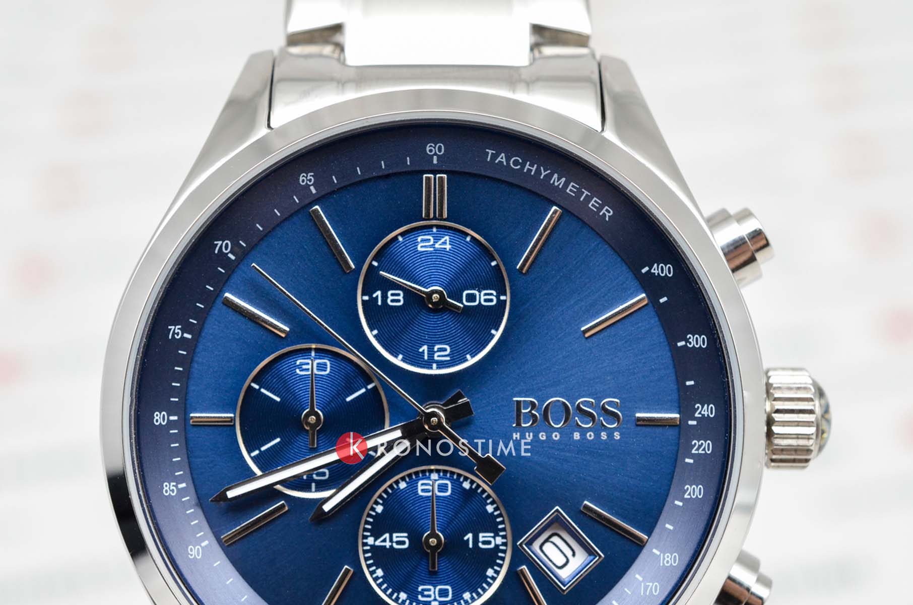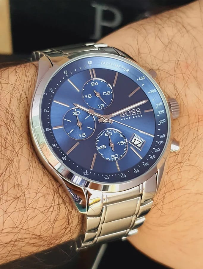 Мужские часы Hugo Boss Grand Prix HB1513478 представлены в 44-мм корпусе из нержавеющей стали с серебристым покрытием. Модель оснащена кварцевым механизмом с функцией хронографаХронографФункция позволяет измерять отрезки времени с особой точностью: часы, минуты, секунды. Верным признаком хронографа является наличие на циферблате 3 дополнительных окошек-счётчиков., тахиметраТахиметрРазмеченная шкала, располагается на ободке или безеле часов. Тахиметр позволяет рассчитать скорость на определённом участке пути, расстояние измеряется в километрах или милях. и секундомераСекундомерСекундоме́р — прибор, способный измерять интервалы времени с точностью до долей секунды., а также окошком даты на позиции 3 часа. Синий циферблат со штриховыми метками защищен устойчивым к царапинам минеральным стекломМинеральное стеклоМинеральное стекло представляет собой искусственно выращенный минерал кварца. Такое стекло отличается особой устойчивостью к повреждениям и царапинам. Уступает по некоторым качествам сапфировому стеклу.. Стальной браслет из нержавеющей стали дополнен раскладной застёжкойРаскладная застёжкаТакой тип застёжки используется только на браслетах из металла. Она никогда не раскрывается полностью, происходит разделение на 2 и более частей. Раскладывающая застёжка снизит вероятность потери часов к минимуму.. Водонепроницаемость WR30 (3 ATM) обеспечивает защиту от брызг воды и дождя.