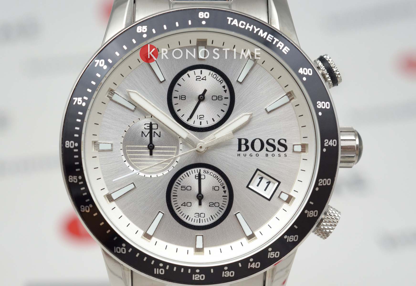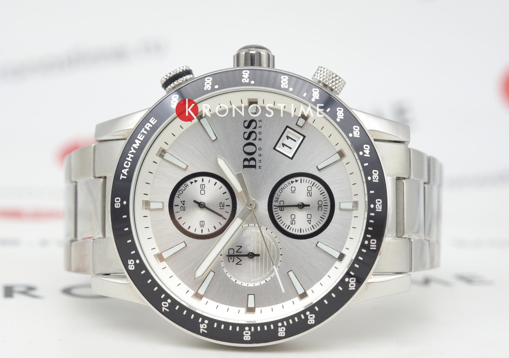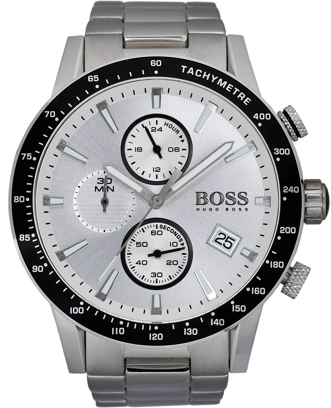 Мужские часы Hugo Boss Rafale Silver HB1513511 представлены в круглом 44-мм корпусе из нержавеющей стали с IP-покрытиемIP-покрытиеМетод ионного напыления. Демонстрирует повышенную устойчивость к истиранию, окислению и химическим веществам. Под воздействием высокого давления и температуры около 1500°C молекулы металла надёжно соединяются с частицами корпуса часов.. Оснащены кварцевым механизмом с функциями хронографаХронографФункция позволяет измерять отрезки времени с особой точностью: часы, минуты, секунды. Верным признаком хронографа является наличие на циферблате 3 дополнительных окошек-счётчиков., секундомеромСекундомерСекундоме́р — прибор, способный измерять интервалы времени с точностью до долей секунды., 30-минутным счетчиком, 24-часовым индикатором и окошком даты на позиции 4 часа. Серебристый циферблат со стрелками и метками защищен сапфировым стекломМинеральное стеклоМинеральное стекло представляет собой искусственно выращенный минерал кварца. Такое стекло отличается особой устойчивостью к повреждениям и царапинам. Уступает по некоторым качествам сапфировому стеклу., а безельБезельВнешний ободок, закрепляющий стекло. В спортивных часах так называется поворотное кольцо с делениями на циферблате, выполняет роль таймера – замеряет отрезки времени на шкале. Неподвижный безель – элемент декора. Однонаправленно вращающийся безель на дайверских часах позволяет фиксировать моменты погружения и выныривания на поверхность. с тахиметрической шкалой добавляет функциональности. Стальной браслет с раскладной застёжкойРаскладная застёжкаТакой тип застёжки используется только на браслетах из металла. Она никогда не раскрывается полностью, происходит разделение на 2 и более частей. Раскладывающая застёжка снизит вероятность потери часов к минимуму. обеспечивает удобную посадку. Водонепроницаемость 50 метров (5 ATM) защищает от брызг.