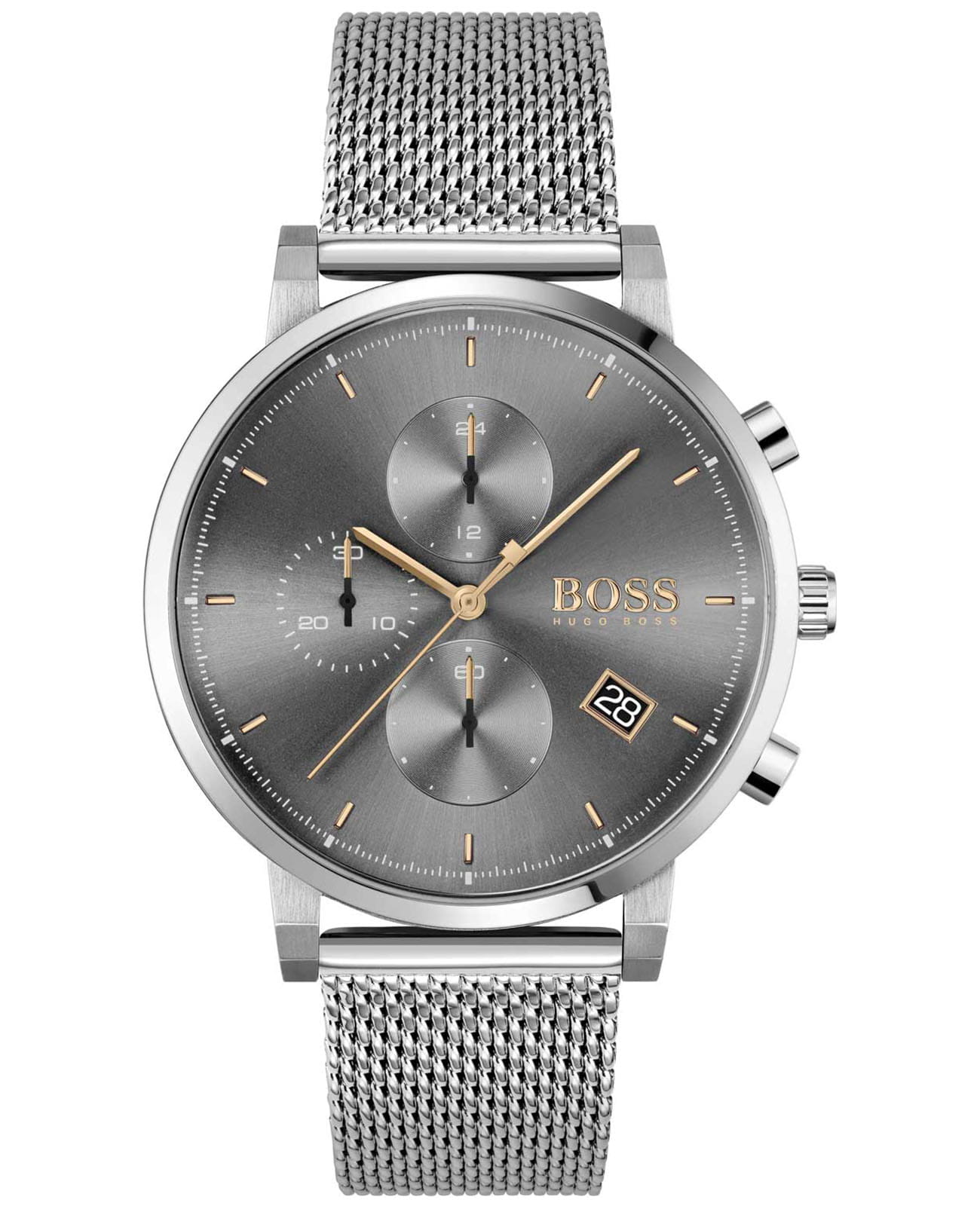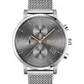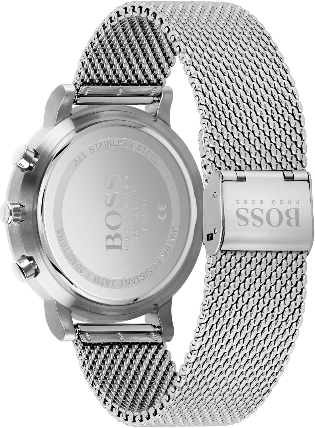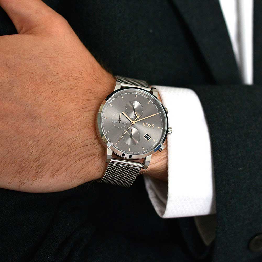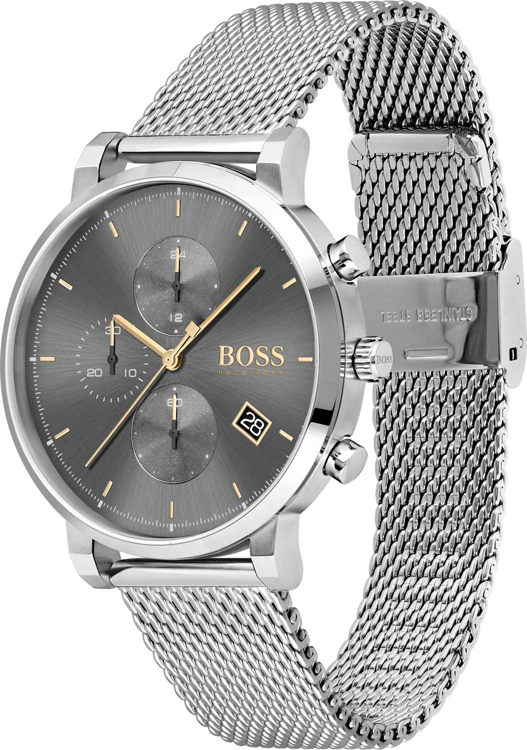 Мужские часы Hugo Boss Integrity HB1513807 представлены в круглом 43-мм корпусе из нержавеющей стали толщиной 9–9,3 мм. Оснащены кварцевым механизмом с функцией хронографаХронографФункция позволяет измерять отрезки времени с особой точностью: часы, минуты, секунды. Верным признаком хронографа является наличие на циферблате 3 дополнительных окошек-счётчиков. и секундомеромСекундомерСекундоме́р — прибор, способный измерять интервалы времени с точностью до долей секунды.. Серый циферблат с эффектом солнечных лучей и окошком даты защищен устойчивым к царапинам минеральным стекломМинеральное стеклоМинеральное стекло представляет собой искусственно выращенный минерал кварца. Такое стекло отличается особой устойчивостью к повреждениям и царапинам. Уступает по некоторым качествам сапфировому стеклу.. Стальной браслет с миланским плетением дополнен раскладной застёжкойРаскладная застёжкаТакой тип застёжки используется только на браслетах из металла. Она никогда не раскрывается полностью, происходит разделение на 2 и более частей. Раскладывающая застёжка снизит вероятность потери часов к минимуму.. Водонепроницаемость 30 метров (3 ATM) обеспечивает защиту от брызг воды и дождя.