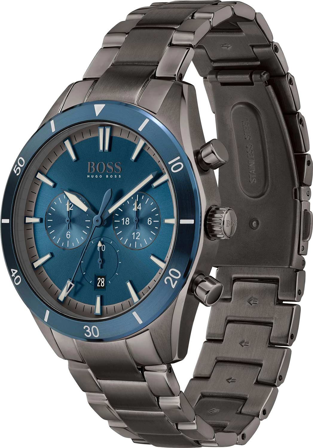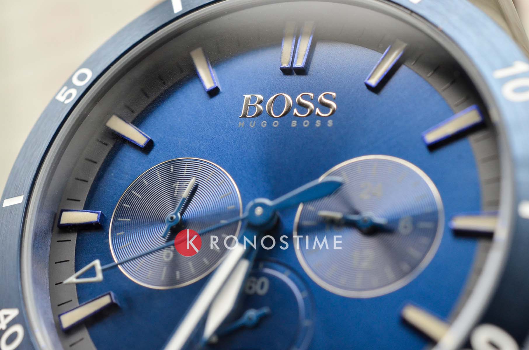 Мужские часы Hugo Boss HB1513863 коллекции Santiago представлены в круглом 44-мм корпусе из нержавеющей стали 316L с IP-покрытиемIP-покрытиеМетод ионного напыления. Демонстрирует повышенную устойчивость к истиранию, окислению и химическим веществам. Под воздействием высокого давления и температуры около 1500°C молекулы металла надёжно соединяются с частицами корпуса часов.. Оснащены кварцевым механизмом с функциями хронографаХронографФункция позволяет измерять отрезки времени с особой точностью: часы, минуты, секунды. Верным признаком хронографа является наличие на циферблате 3 дополнительных окошек-счётчиков., секундомеромСекундомерСекундоме́р — прибор, способный измерять интервалы времени с точностью до долей секунды. и тахиметрической шкалойТахиметрРазмеченная шкала, располагается на ободке или безеле часов. Тахиметр позволяет рассчитать скорость на определённом участке пути, расстояние измеряется в километрах или милях., а также индикацией даты. Синий циферблат с метками в виде штрихов защищен устойчивым к царапинам минеральным стекломМинеральное стеклоМинеральное стекло представляет собой искусственно выращенный минерал кварца. Такое стекло отличается особой устойчивостью к повреждениям и царапинам. Уступает по некоторым качествам сапфировому стеклу.. Стальной браслет с IP-покрытиемIP-покрытиеМетод ионного напыления. Демонстрирует повышенную устойчивость к истиранию, окислению и химическим веществам. Под воздействием высокого давления и температуры около 1500°C молекулы металла надёжно соединяются с частицами корпуса часов. дополнен раскладной застёжкойРаскладная застёжкаТакой тип застёжки используется только на браслетах из металла. Она никогда не раскрывается полностью, происходит разделение на 2 и более частей. Раскладывающая застёжка снизит вероятность потери часов к минимуму.. Водонепроницаемость 50 метров (5 ATM) обеспечивает защиту от брызг и дождя.