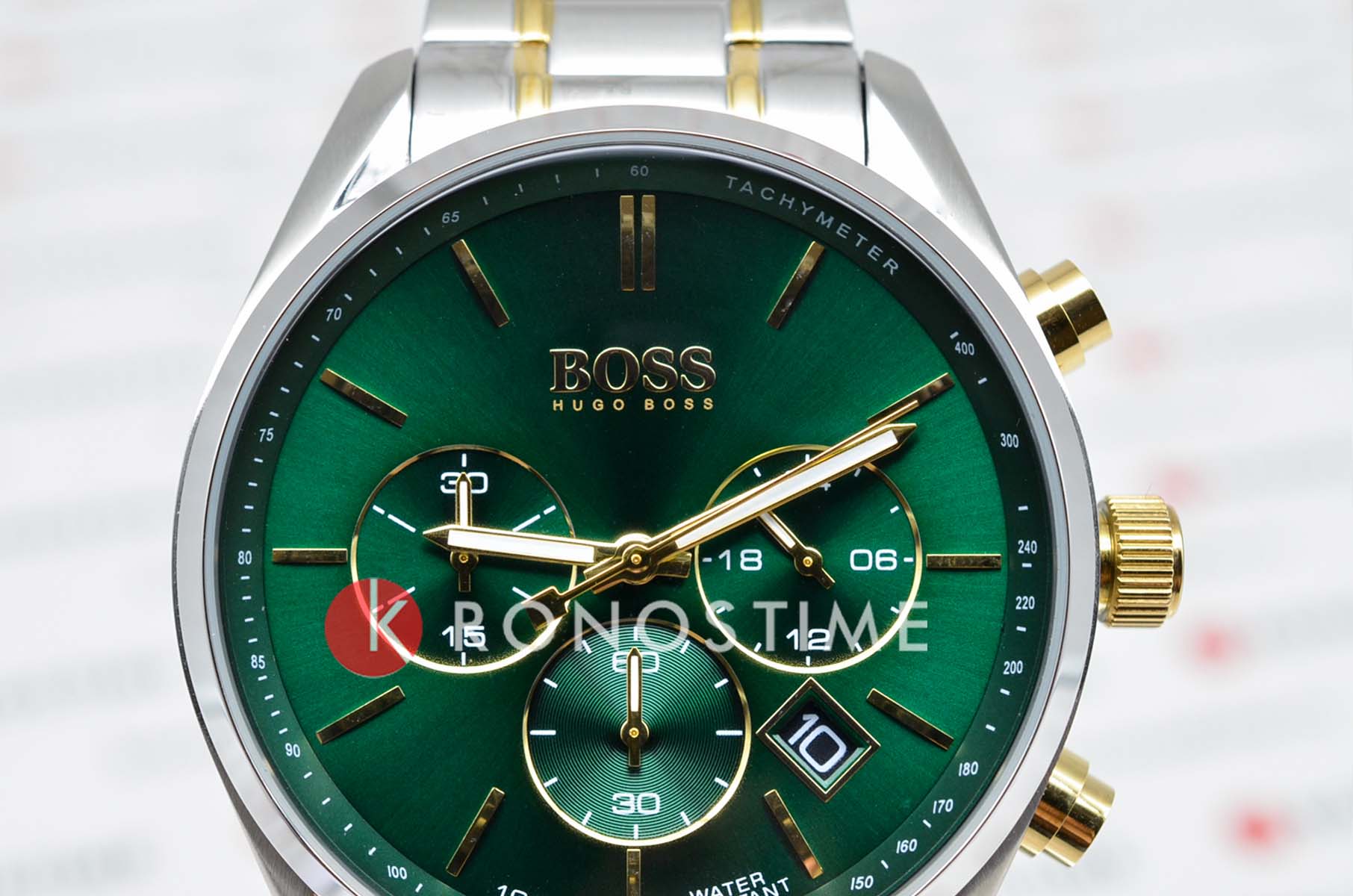Мужские часы Hugo Boss Champion HB1513878 представлены в круглом 44-мм корпусе из нержавеющей стали. Изысканные часы оснащены кварцевым механизмом с функциями хронографаХронографФункция позволяет измерять отрезки времени с особой точностью: часы, минуты, секунды. Верным признаком хронографа является наличие на циферблате 3 дополнительных окошек-счётчиков.,  тахиметраТахиметрРазмеченная шкала, располагается на ободке или безеле часов. Тахиметр позволяет рассчитать скорость на определённом участке пути, расстояние измеряется в километрах или милях. и секундомераСекундомерСекундоме́р — прибор, способный измерять интервалы времени с точностью до долей секунды., а также индикацией даты. Эффектный зеленый циферблат с метками в виде штрихов защищен устойчивым к царапинам минеральным стекломМинеральное стеклоМинеральное стекло представляет собой искусственно выращенный минерал кварца. Такое стекло отличается особой устойчивостью к повреждениям и царапинам. Уступает по некоторым качествам сапфировому стеклу.. Браслет из стали серебристого цвета c PVD-покрытиемPVDУльтратонкое покрытие наносится в технике вакуумного напыления, сочетает в себе нитрид титана особой прочности со слоем золота или оксида хрома. Несёт в себе декоративную или защитную функцию. дополнен раскладной застёжкойРаскладная застёжкаТакой тип застёжки используется только на браслетах из металла. Она никогда не раскрывается полностью, происходит разделение на 2 и более частей. Раскладывающая застёжка снизит вероятность потери часов к минимуму.. Водонепроницаемость 100 метров (10 ATM) обеспечивает защиту от брызг и дождя. Hugo Boss Champion HB1513878 — это не просто часы, а настоящее произведение часового искусства, способное подчеркнуть вашу индивидуальность и статус.