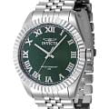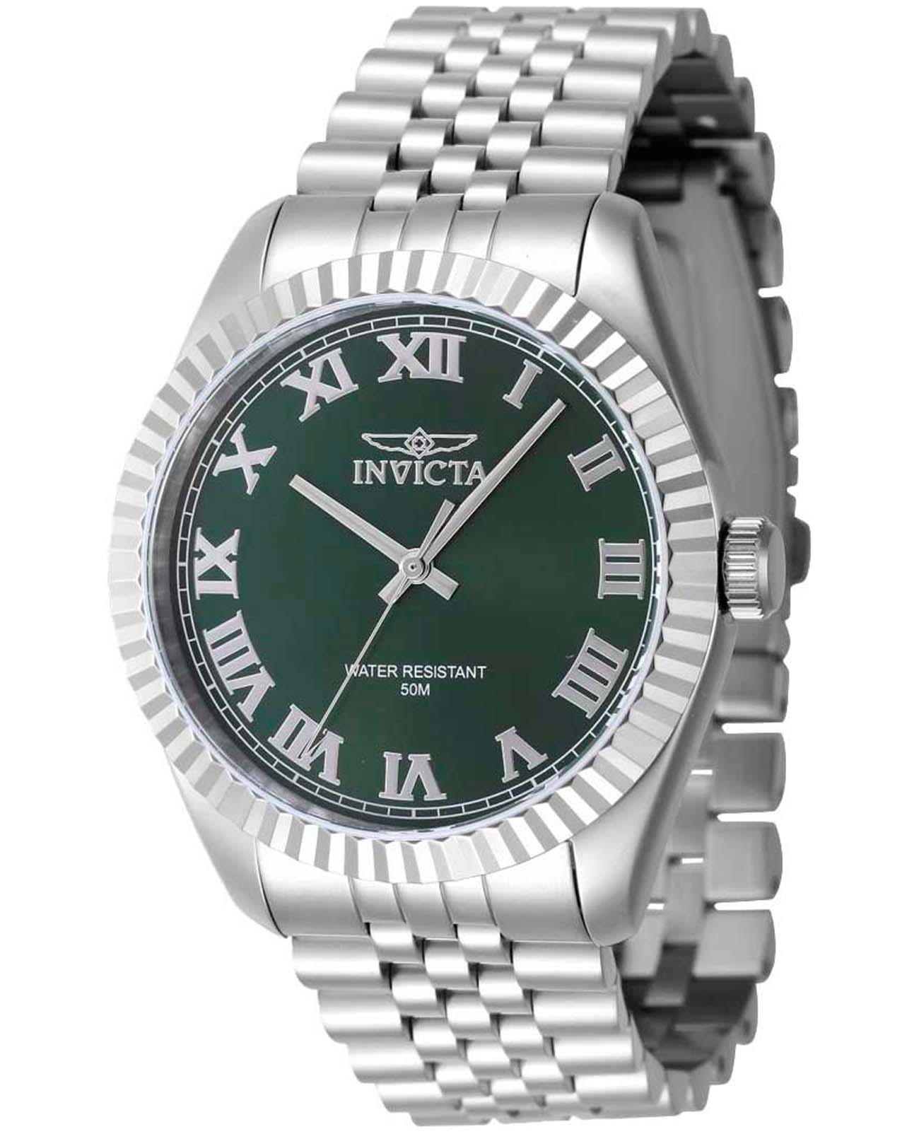 Мужские наручные часы Invicta Specialty IN47398 сочетают в себе классический дизайн и надежность современных технологий . Модель обладает круглым корпусом, выполненным из нержавеющей стали, что обеспечивает высокую устойчивость к внешним воздействиям. БезельБезельВнешний ободок, закрепляющий стекло. В спортивных часах так называется поворотное кольцо с делениями на циферблате, выполняет роль таймера – замеряет отрезки времени на шкале. Неподвижный безель – элемент декора. Однонаправленно вращающийся безель на дайверских часах позволяет фиксировать моменты погружения и выныривания на поверхность. украшен рифленой отделкой, придающей часам дополнительную элегантность . Браслет также изготовлен из нержавеющей стали и оснащен раскладывающейся застежкойРаскладной замокДанный вариант застежки используется только на часах с металлическим браслетом. Отличительная особенность такого крепления в том, что длина браслета становится универсальной и вы можете самостоятельно отрегулировать нужный вам размер – застежка просто двигается по браслету часов., гарантирующей комфортное ношение и безопасность . Зеленый циферблат дополнен метками в виде римских цифр. Для защиты используется минеральное стеклоМинеральное стеклоМинеральное стекло представляет собой искусственно выращенный минерал кварца. Такое стекло отличается особой устойчивостью к повреждениям и царапинам. Уступает по некоторым качествам сапфировому стеклу., которое обеспечивает прочность и устойчивость к царапинам. Часы оснащены кварцевым механизмом калибра Seiko PC21, что гарантирует точность хода без необходимости подзаводки. Водонепроницаемость модели достигает 50 метров (5 атмосфер), что позволяет использовать их в повседневной жизни, включая контакт с водой, например, при мытье рук или дожде. Сочетание классического дизайна и функциональности делает эту модель универсальным аксессуаром для различных случаев жизни.