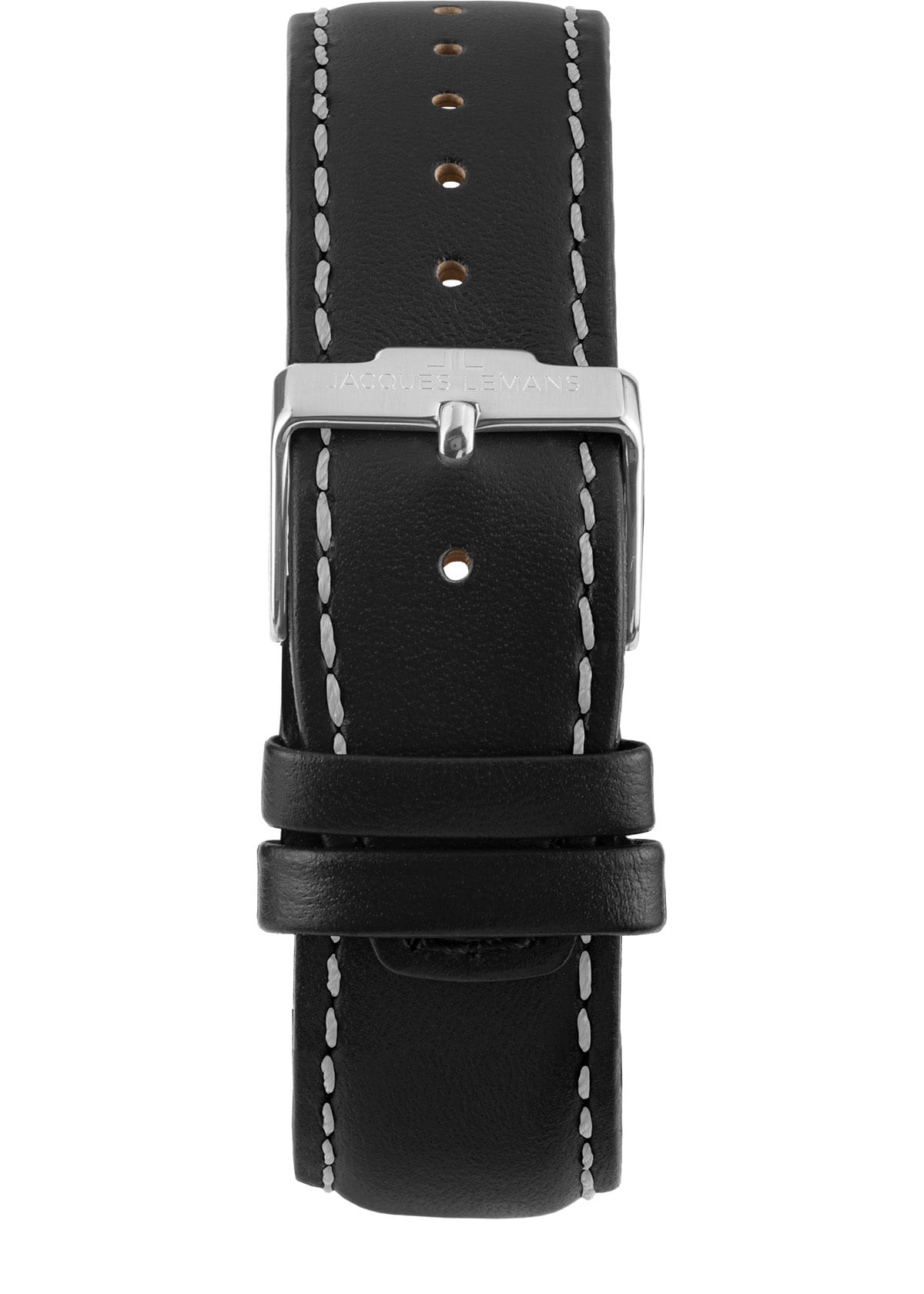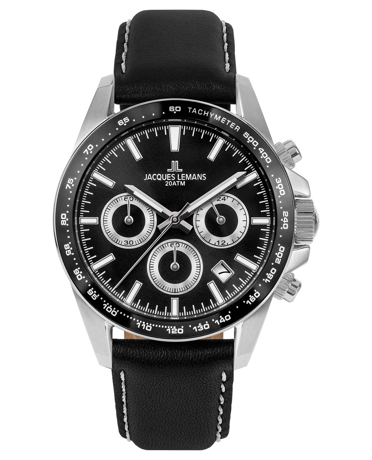 Мужские часы Jacques Lemans Liverpool 1-1877A с минеральным стекломМинеральное стеклоМинеральное стекло представляет собой искусственно выращенный минерал кварца. Такое стекло отличается особой устойчивостью к повреждениям и царапинам. Уступает по некоторым качествам сапфировому стеклу., кварцевый механизм с высокой точностью. Часы- хронографХронографФункция позволяет измерять отрезки времени с особой точностью: часы, минуты, секунды. Верным признаком хронографа является наличие на циферблате 3 дополнительных окошек-счётчиков. с секундомеромСекундомерСекундоме́р — прибор, способный измерять интервалы времени с точностью до долей секунды. представляют собой стильный аксессуар, отражающий идеальное сочетание современного дизайна, надёжности и функциональности.  Неподвижный безельБезельВнешний ободок, закрепляющий стекло. В спортивных часах так называется поворотное кольцо с делениями на циферблате, выполняет роль таймера – замеряет отрезки времени на шкале. Неподвижный безель – элемент декора. Однонаправленно вращающийся безель на дайверских часах позволяет фиксировать моменты погружения и выныривания на поверхность. из нержавеющей стали с PVDPVDУльтратонкое покрытие наносится в технике вакуумного напыления, сочетает в себе нитрид титана особой прочности со слоем золота или оксида хрома. Несёт в себе декоративную или защитную функцию. покрытием и с тахиметромТахиметрРазмеченная шкала, располагается на ободке или безеле часов. Тахиметр позволяет рассчитать скорость на определённом участке пути, расстояние измеряется в километрах или милях.. На циферблате расположены два дополнительных индикатора и окошко даты. Стрелки и метки с люминесцентным покрытиемЛюминесцентное покрытиеПозволяет считывать показания времени в темноте. Производители наносят на стрелки, часовые индексы, безель или поверхность циферблата светонакопительный состав, дающий холодное свечение.. Класс водозащиты: 200 метров, позволит плавать, нырять и заниматься другими водными видами спорта. Рифленая заводная головка с защитой. Ремешок из натуральной кожи на стандартной застежке.