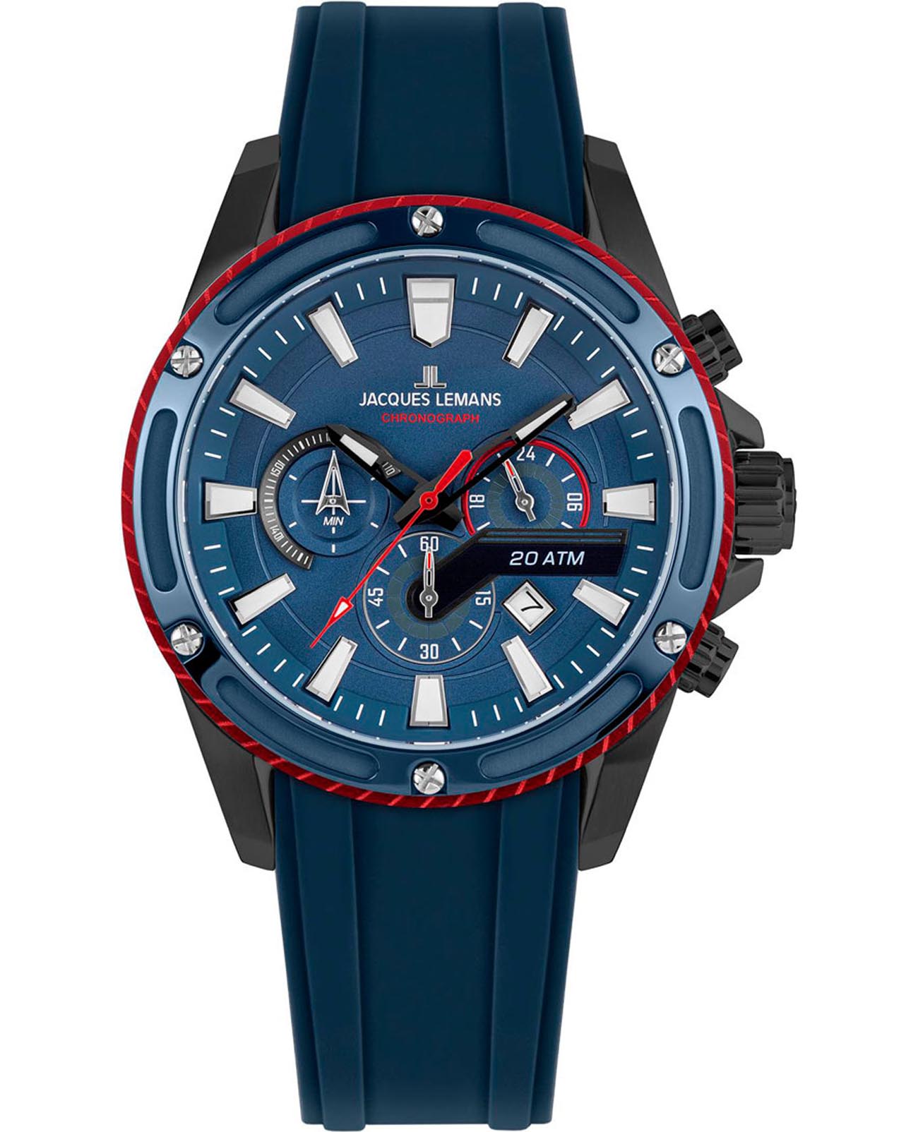 Мужские часы Jacques Lemans Liverpool 1-2141B с минеральным стекломМинеральное стеклоМинеральное стекло представляет собой искусственно выращенный минерал кварца. Такое стекло отличается особой устойчивостью к повреждениям и царапинам. Уступает по некоторым качествам сапфировому стеклу., кварцевый механизм с высокой точностью. Часы- хронографХронографФункция позволяет измерять отрезки времени с особой точностью: часы, минуты, секунды. Верным признаком хронографа является наличие на циферблате 3 дополнительных окошек-счётчиков. с секундомеромСекундомерСекундоме́р — прибор, способный измерять интервалы времени с точностью до долей секунды. представляют собой стильный аксессуар, отражающий идеальное сочетание современного дизайна, надёжности и функциональности. Корпус и безельБезельВнешний ободок, закрепляющий стекло. В спортивных часах так называется поворотное кольцо с делениями на циферблате, выполняет роль таймера – замеряет отрезки времени на шкале. Неподвижный безель – элемент декора. Однонаправленно вращающийся безель на дайверских часах позволяет фиксировать моменты погружения и выныривания на поверхность. из нержавеющей стали с PVDPVDУльтратонкое покрытие наносится в технике вакуумного напыления, сочетает в себе нитрид титана особой прочности со слоем золота или оксида хрома. Несёт в себе декоративную или защитную функцию. покрытием. БезельБезельВнешний ободок, закрепляющий стекло. В спортивных часах так называется поворотное кольцо с делениями на циферблате, выполняет роль таймера – замеряет отрезки времени на шкале. Неподвижный безель – элемент декора. Однонаправленно вращающийся безель на дайверских часах позволяет фиксировать моменты погружения и выныривания на поверхность. с декоративными прорезями крепится к корпусу шестью винтами. На циферблате расположены три дополнительных индикатора и окошко даты. Стрелки и метки с люминесцентным покрытиемЛюминесцентное покрытиеПозволяет считывать показания времени в темноте. Производители наносят на стрелки, часовые индексы, безель или поверхность циферблата светонакопительный состав, дающий холодное свечение.. Класс водозащиты: 200 метров, позволит плавать, нырять и заниматься другими водными видами спорта. Силиконовый ремешок на стандартной застёжке.