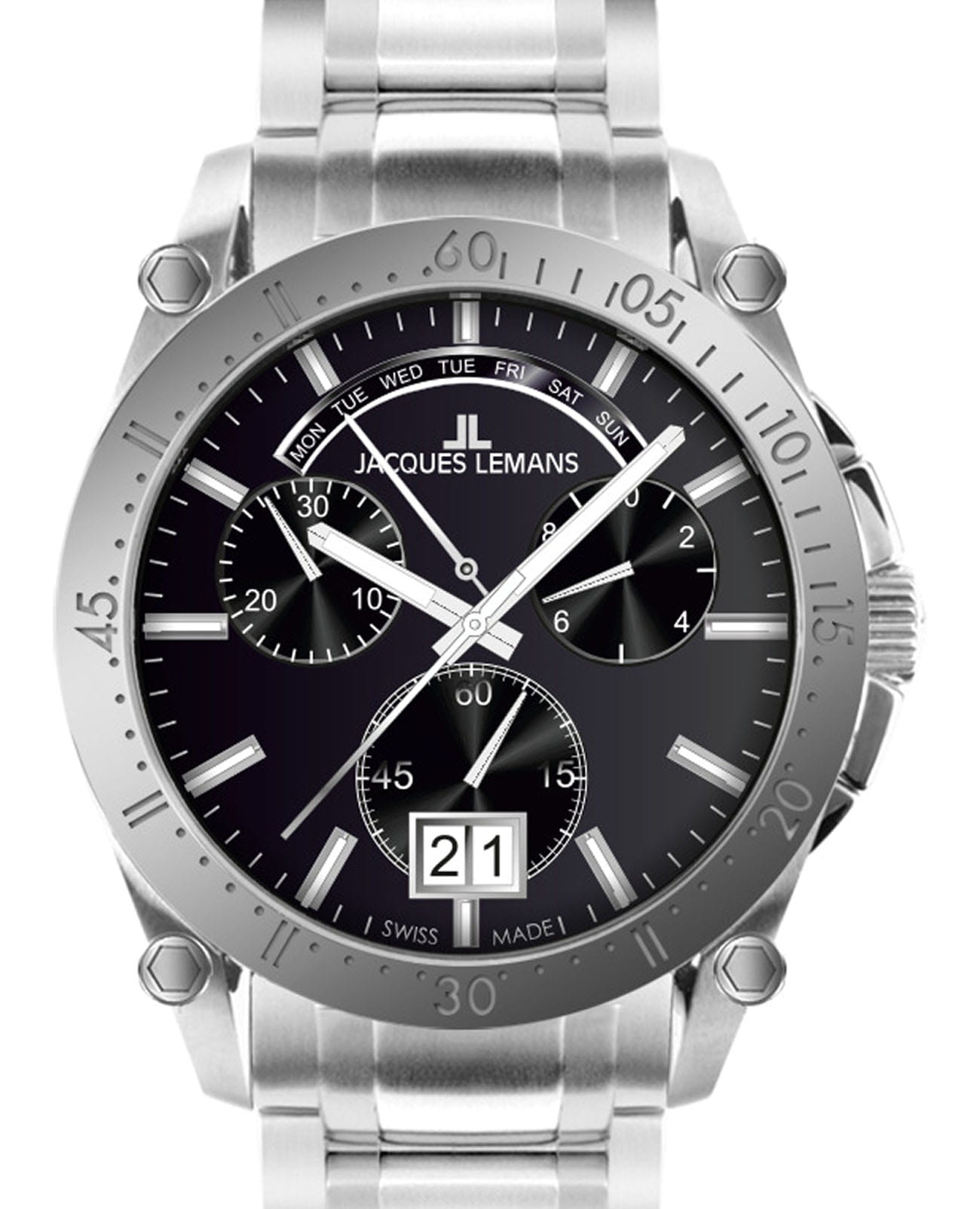 Мужские часы-хронографХронографФункция позволяет измерять отрезки времени с особой точностью: часы, минуты, секунды. Верным признаком хронографа является наличие на циферблате 3 дополнительных окошек-счётчиков. Jacques Lemans 1-2198D – лаконичная красота и изысканная элегантность. Оригинальная модель с классическим оформлением станет превосходным завершением образа, наделив его индивидуальным характером. Корпус выполнен из нержавеющей стали, диаметром 44 мм, что обеспечивает долговечность и утончённый внешний вид. Ударопрочное минеральное стеклоМинеральное стеклоМинеральное стекло представляет собой искусственно выращенный минерал кварца. Такое стекло отличается особой устойчивостью к повреждениям и царапинам. Уступает по некоторым качествам сапфировому стеклу. с сапфировым напылением защищает циферблат от царапин. Стальной браслет на раскладной застёжкеРаскладная застёжкаТакой тип застёжки используется только на браслетах из металла. Она никогда не раскрывается полностью, происходит разделение на 2 и более частей. Раскладывающая застёжка снизит вероятность потери часов к минимуму. обеспечивает комфортное ношение. Водозащита 100 метров позволит плавать, нырять и заниматься другими водными видами спорта. Стрелки и метки с люминесцентным покрытиемЛюминесцентное покрытиеПозволяет считывать показания времени в темноте. Производители наносят на стрелки, часовые индексы, безель или поверхность циферблата светонакопительный состав, дающий холодное свечение. позволяющие легко определять время даже в темноте. Окошко даты находится в положении 6 часов. Широкое окошко дня недели в положении 12 часов позволяет показывать название дня недели. Это аксессуар для мужчины, который ценит классический стиль и функциональность.