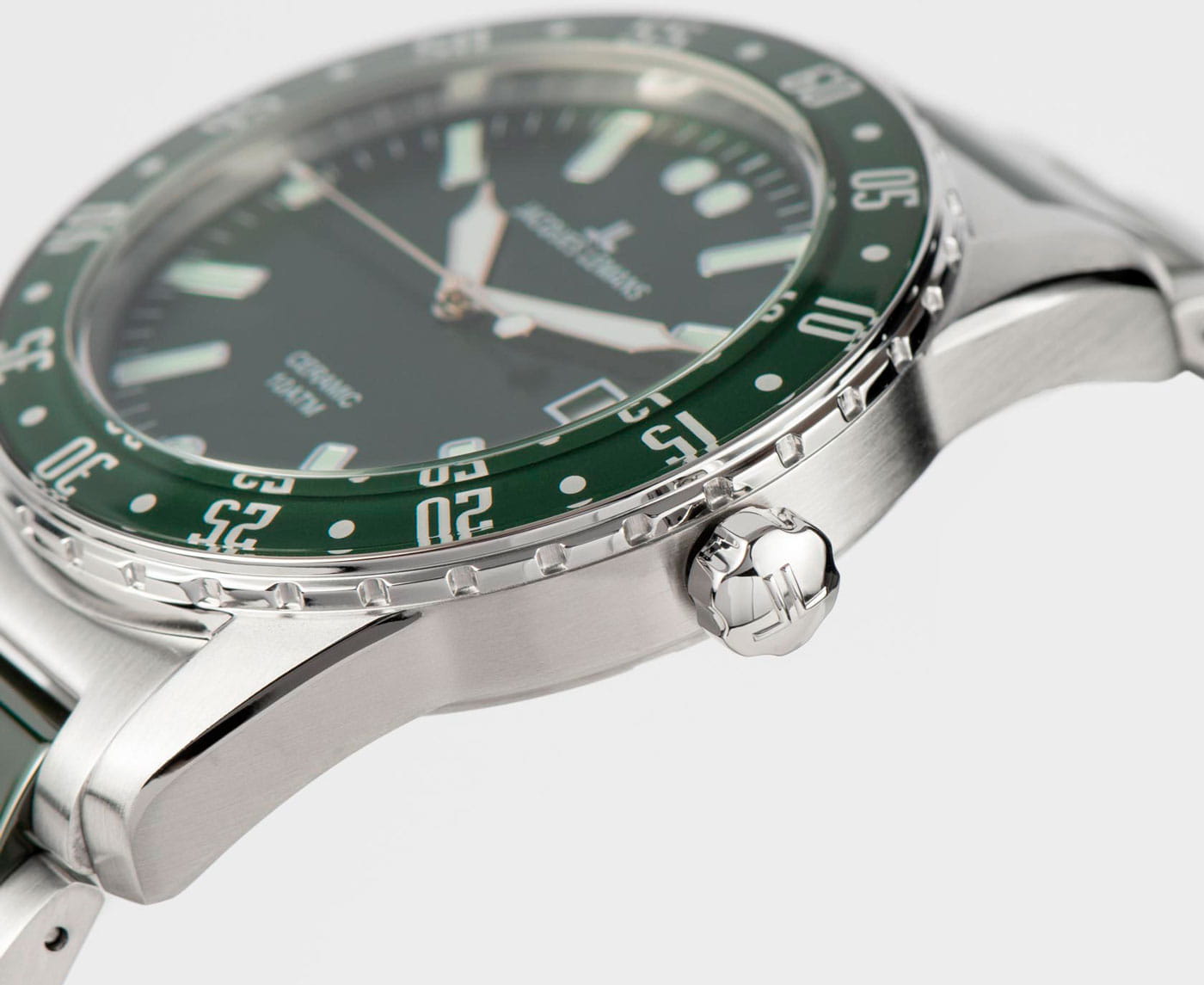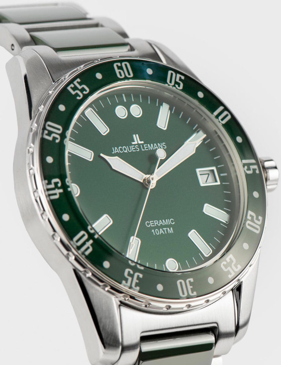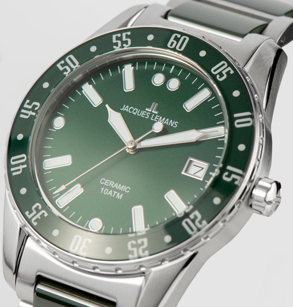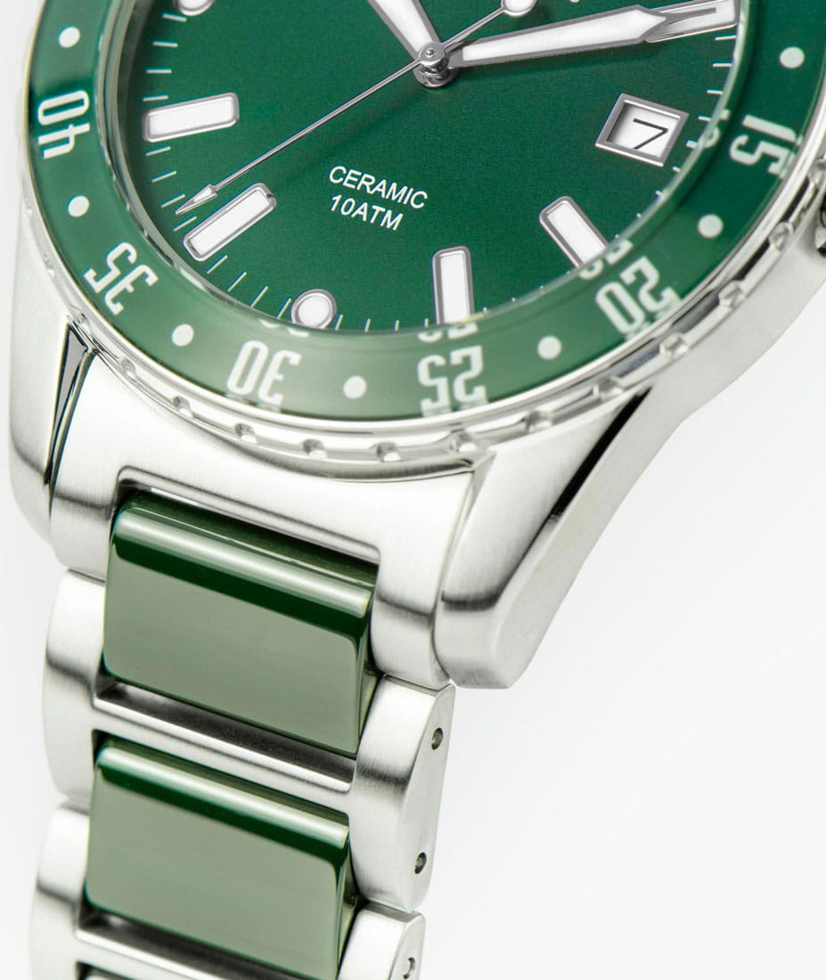 Часы с явными спортивными акцентами могут выглядеть элегантно. Крупный корпус диаметром 42 мм сделан из нержавеющей стали, на широкий безельБезельВнешний ободок, закрепляющий стекло. В спортивных часах так называется поворотное кольцо с делениями на циферблате, выполняет роль таймера – замеряет отрезки времени на шкале. Неподвижный безель – элемент декора. Однонаправленно вращающийся безель на дайверских часах позволяет фиксировать моменты погружения и выныривания на поверхность. вынесена дополнительная индикация. Точный кварцевый механизм отвечает за движение хорошо читаемых стрелок, покрытых люминесцентным составомЛюминесцентное покрытиеПозволяет считывать показания времени в темноте. Производители наносят на стрелки, часовые индексы, безель или поверхность циферблата светонакопительный состав, дающий холодное свечение.. Таким же образом выделены и индексы, поэтому время по этим часам легко определить даже в темноте. В положении «3 часа» находится окошко даты. Еще одна спортивная составляющая — повышенная водостойкость, равная 10 атмосфер: в часах можно плавать. Вместе с этим, модель идеально впишется и в классический образ, и в повседневный. Особая деталь — звенья браслета из высокотехнологичной керамикиВысокотехнологичная керамикаИнновационный запатентованный Rado материал с гладкой или матовой поверхностью. Керамика за счёт кристаллической структуры обладает повышенной устойчивостью от возникновения царапин. Материал способен принимать температуру тела человека, обеспечивая невероятный комфорт при ношении. зеленого цвета, в тон циферблату. Этот материал удобно носить даже в мороз: он быстро нагревается до комфортной температуры тела. К тому же, керамика стойко сопротивляется появлению микроцарапин. На браслет установлена раскладная застёжкаРаскладная застёжкаТакой тип застёжки используется только на браслетах из металла. Она никогда не раскрывается полностью, происходит разделение на 2 и более частей. Раскладывающая застёжка снизит вероятность потери часов к минимуму..