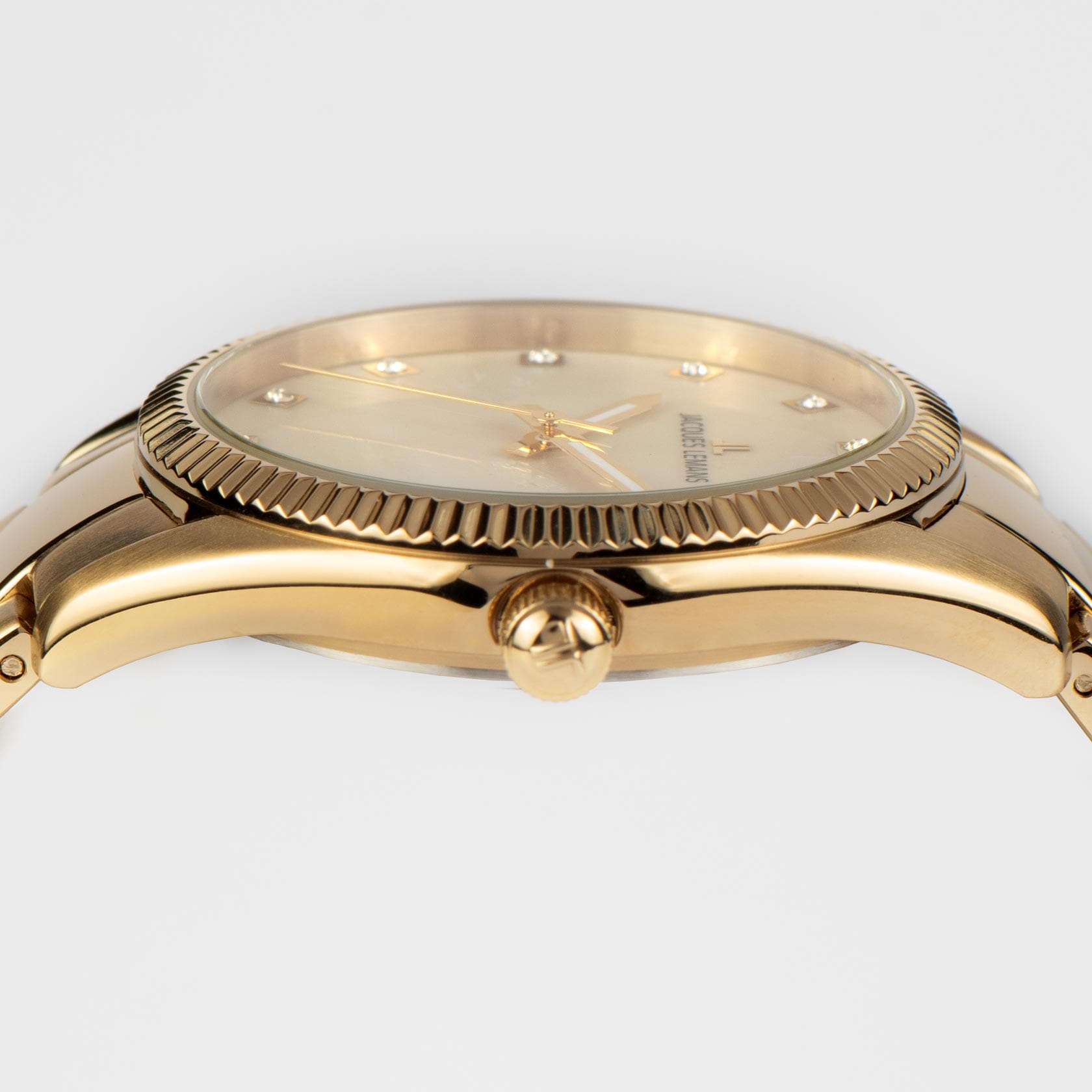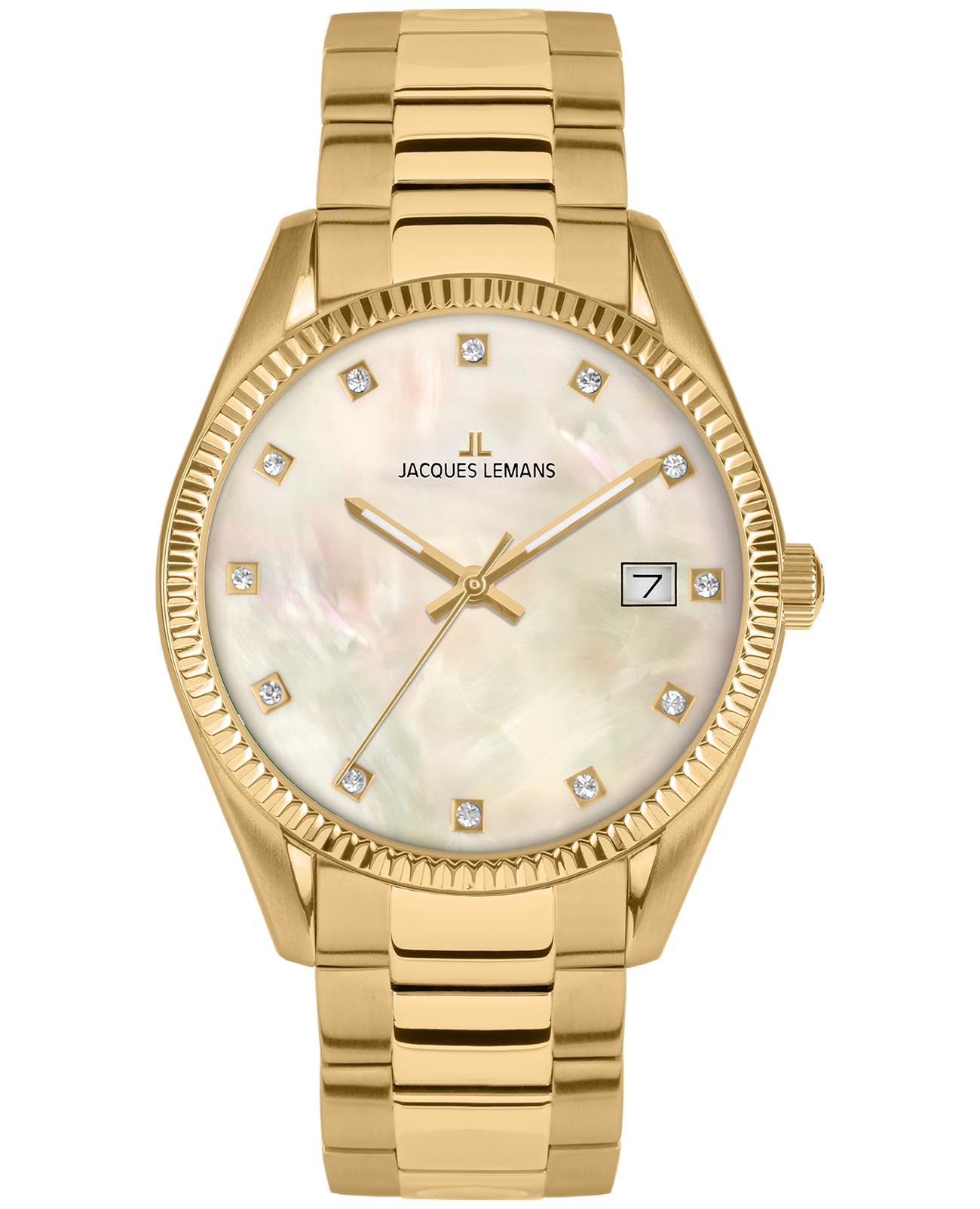 Женские наручные часы, выпущенные в честь 50-летия компании Jacques Lemans. Кварцевый механизм с высокой точностью. Минеральное стеклоМинеральное стеклоМинеральное стекло представляет собой искусственно выращенный минерал кварца. Такое стекло отличается особой устойчивостью к повреждениям и царапинам. Уступает по некоторым качествам сапфировому стеклу. устойчивое к появлению царапин, обладающее высокой прозрачностью. Окошко даты расположилось на трех часах. Стрелки и метки с люминесцентным покрытиемЛюминесцентное покрытиеПозволяет считывать показания времени в темноте. Производители наносят на стрелки, часовые индексы, безель или поверхность циферблата светонакопительный состав, дающий холодное свечение.. БезельБезельВнешний ободок, закрепляющий стекло. В спортивных часах так называется поворотное кольцо с делениями на циферблате, выполняет роль таймера – замеряет отрезки времени на шкале. Неподвижный безель – элемент декора. Однонаправленно вращающийся безель на дайверских часах позволяет фиксировать моменты погружения и выныривания на поверхность. с PVD-покрытиемPVDУльтратонкое покрытие наносится в технике вакуумного напыления, сочетает в себе нитрид титана особой прочности со слоем золота или оксида хрома. Несёт в себе декоративную или защитную функцию.. Класс водозащиты: 100 метров, позволит плавать, нырять и заниматься другими водными видами спорта. Корпус из нержавеющей стали с PVD-покрытиемPVDУльтратонкое покрытие наносится в технике вакуумного напыления, сочетает в себе нитрид титана особой прочности со слоем золота или оксида хрома. Несёт в себе декоративную или защитную функцию.. Браслет часов изготовлен из нержавеющей стали с PVD-покрытиемPVDУльтратонкое покрытие наносится в технике вакуумного напыления, сочетает в себе нитрид титана особой прочности со слоем золота или оксида хрома. Несёт в себе декоративную или защитную функцию..