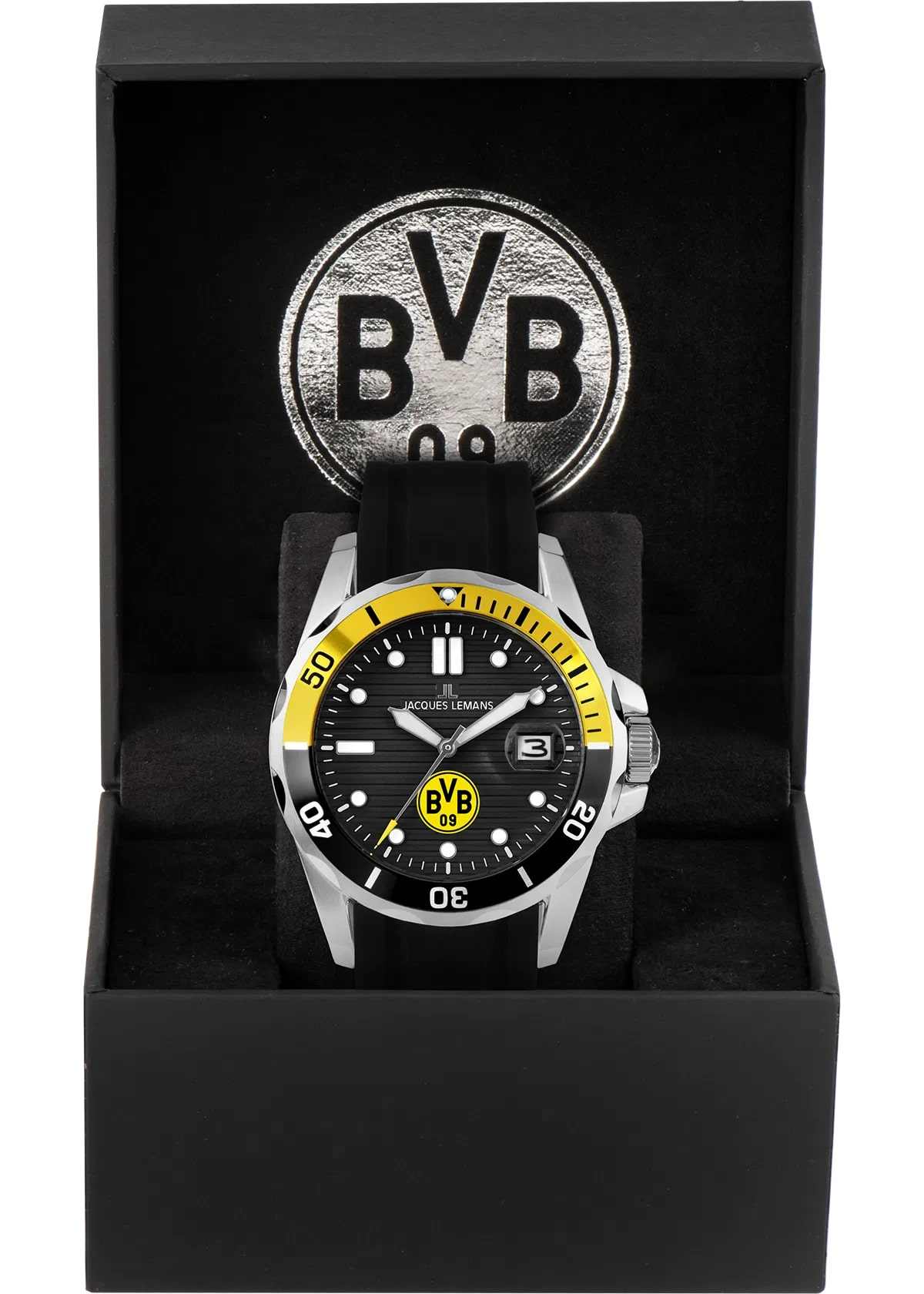 Мужские часы Jacques Lemans Borussia Dortmund BVB-07 — это стильное сочетание элегантности и современного дизайна. Корпус из нержавеющей стали диаметром 41 мм идеально сбалансирован и элегантен. Минеральное стеклоМинеральное стеклоМинеральное стекло представляет собой искусственно выращенный минерал кварца. Такое стекло отличается особой устойчивостью к повреждениям и царапинам. Уступает по некоторым качествам сапфировому стеклу. Crystex защищает циферблат от царапин. Удобный силиконовый ремешок с классической застежкой идеально дополняют дизайн часов, обеспечивая комфортное ношение. Стрелки и метки с люминесцентным покрытиемЛюминесцентное покрытиеПозволяет считывать показания времени в темноте. Производители наносят на стрелки, часовые индексы, безель или поверхность циферблата светонакопительный состав, дающий холодное свечение.. БезельБезельВнешний ободок, закрепляющий стекло. В спортивных часах так называется поворотное кольцо с делениями на циферблате, выполняет роль таймера – замеряет отрезки времени на шкале. Неподвижный безель – элемент декора. Однонаправленно вращающийся безель на дайверских часах позволяет фиксировать моменты погружения и выныривания на поверхность. с PVDPVDУльтратонкое покрытие наносится в технике вакуумного напыления, сочетает в себе нитрид титана особой прочности со слоем золота или оксида хрома. Несёт в себе декоративную или защитную функцию. покрытием обрамляет циферблат. Часы обладают впечатляющей водонепроницаемостью до 10 бар (100 метров), что делает их идеальными для повседневной носки. Окошко даты с увеличительным стеклом находится в положении 3 часа. Рифленая заводная головка с защитой. Циферблат украшает логотип клуба «Боруссия», одного из самых знаковых футбольных клубов в мире.