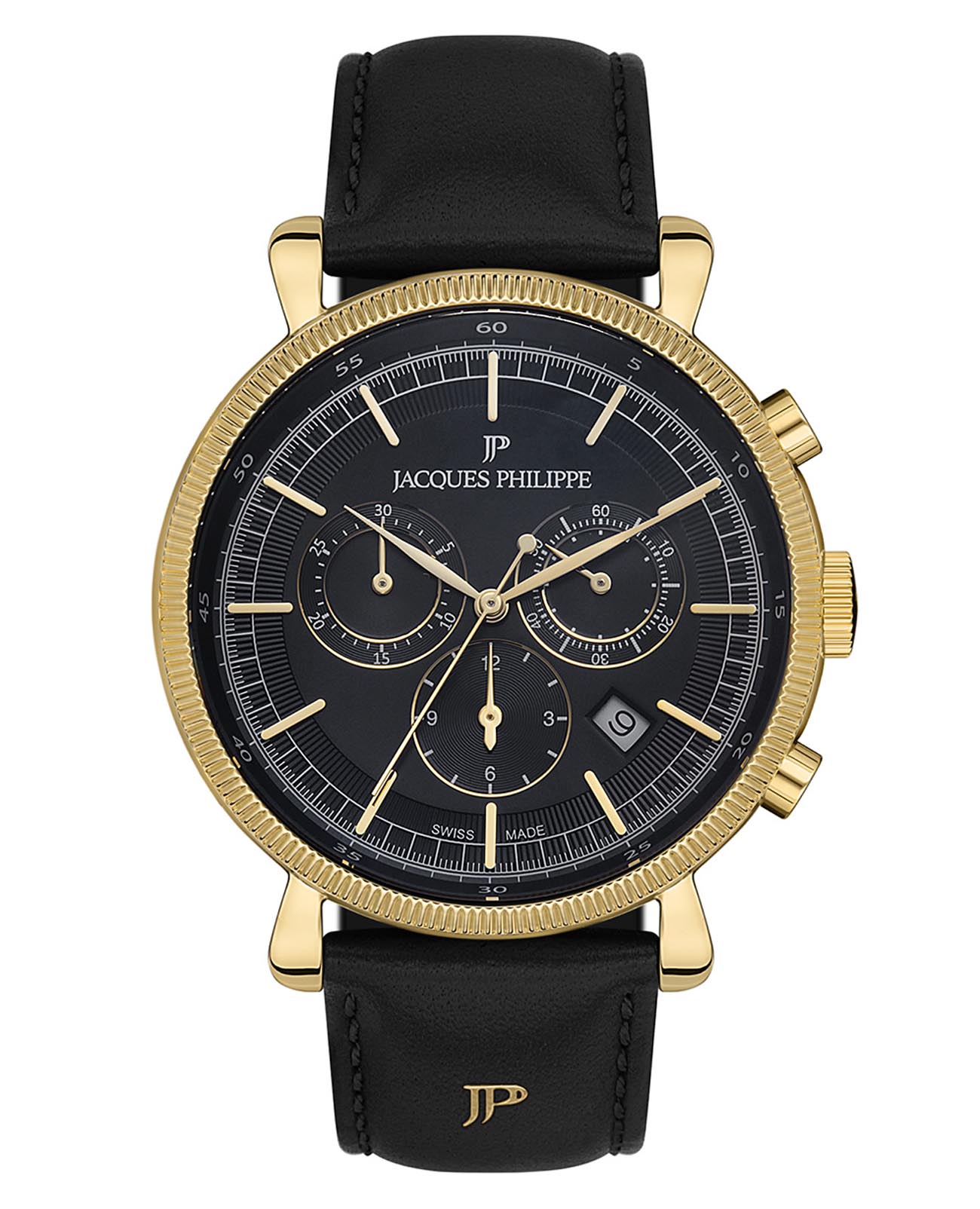 Швейцарские мужские часы-хронографХронографФункция позволяет измерять отрезки времени с особой точностью: часы, минуты, секунды. Верным признаком хронографа является наличие на циферблате 3 дополнительных окошек-счётчиков. с секундомеромСекундомерСекундоме́р — прибор, способный измерять интервалы времени с точностью до долей секунды. Jacques Philippe Vintage JPQGC192111, кварцевый механизм с высокой точностью. Сапфировое стеклоСапфировое стеклоПрочный и надёжный материал из кристалла сапфира синтетического происхождения, характеризующийся особой твёрдостью и устойчивостью к царапинам и повреждениям. устойчивое к появлению царапин, обладающее высокой прозрачностью. Корпус часов изготовлен из нержавеющей стали с IP-покрытиемIP-покрытиеМетод ионного напыления. Демонстрирует повышенную устойчивость к истиранию, окислению и химическим веществам. Под воздействием высокого давления и температуры около 1500°C молекулы металла надёжно соединяются с частицами корпуса часов.. На циферблате три дополнительных индикатора. Окошко даты находится между 4 и 5 часами. Класс водозащиты: 50 метров, позволит защитить корпус от случайных брызг или капель дождя. Кожаный ремешок на стандартной застёжке.