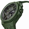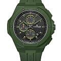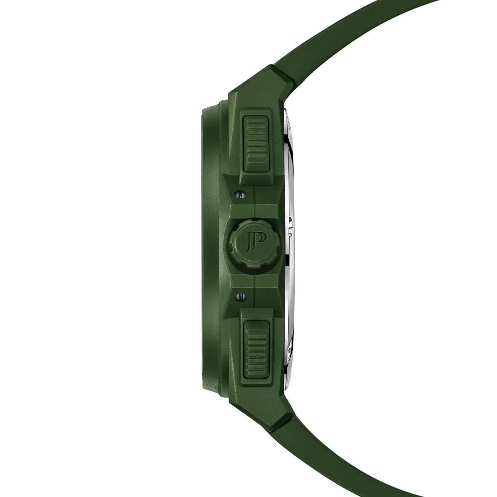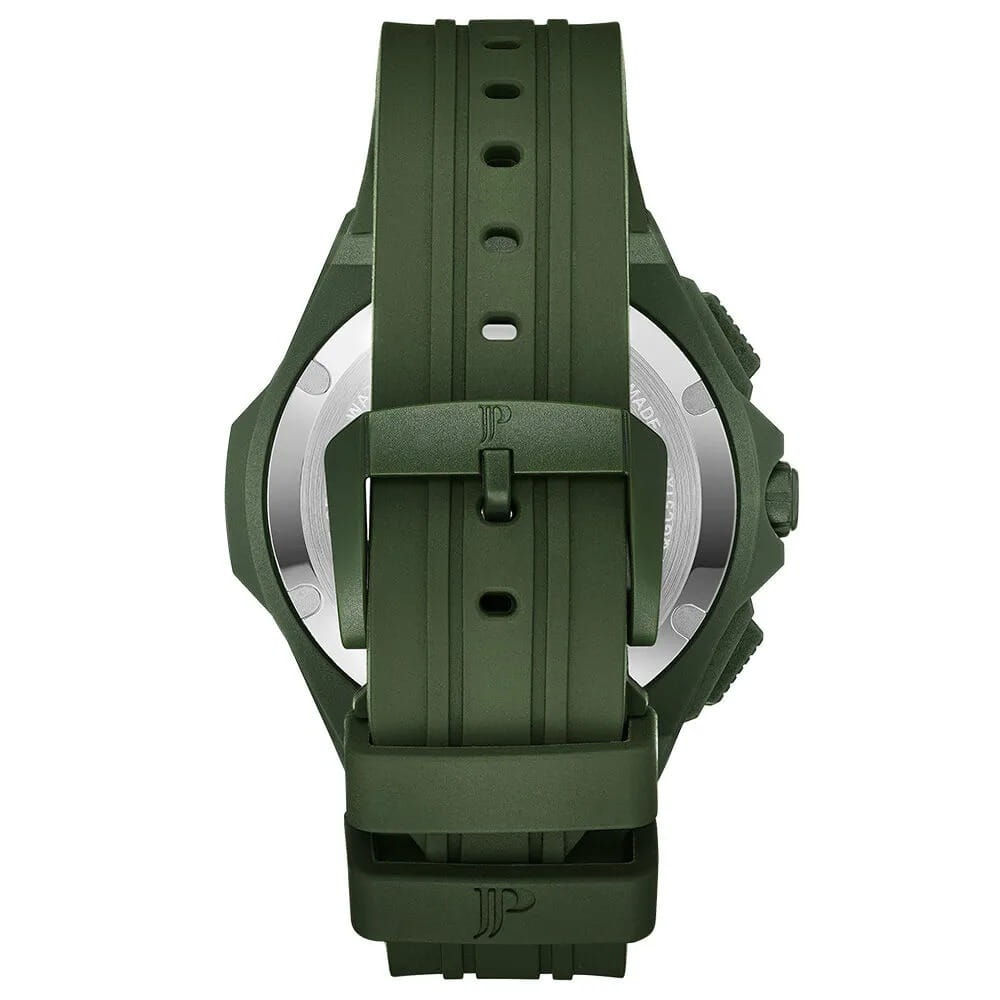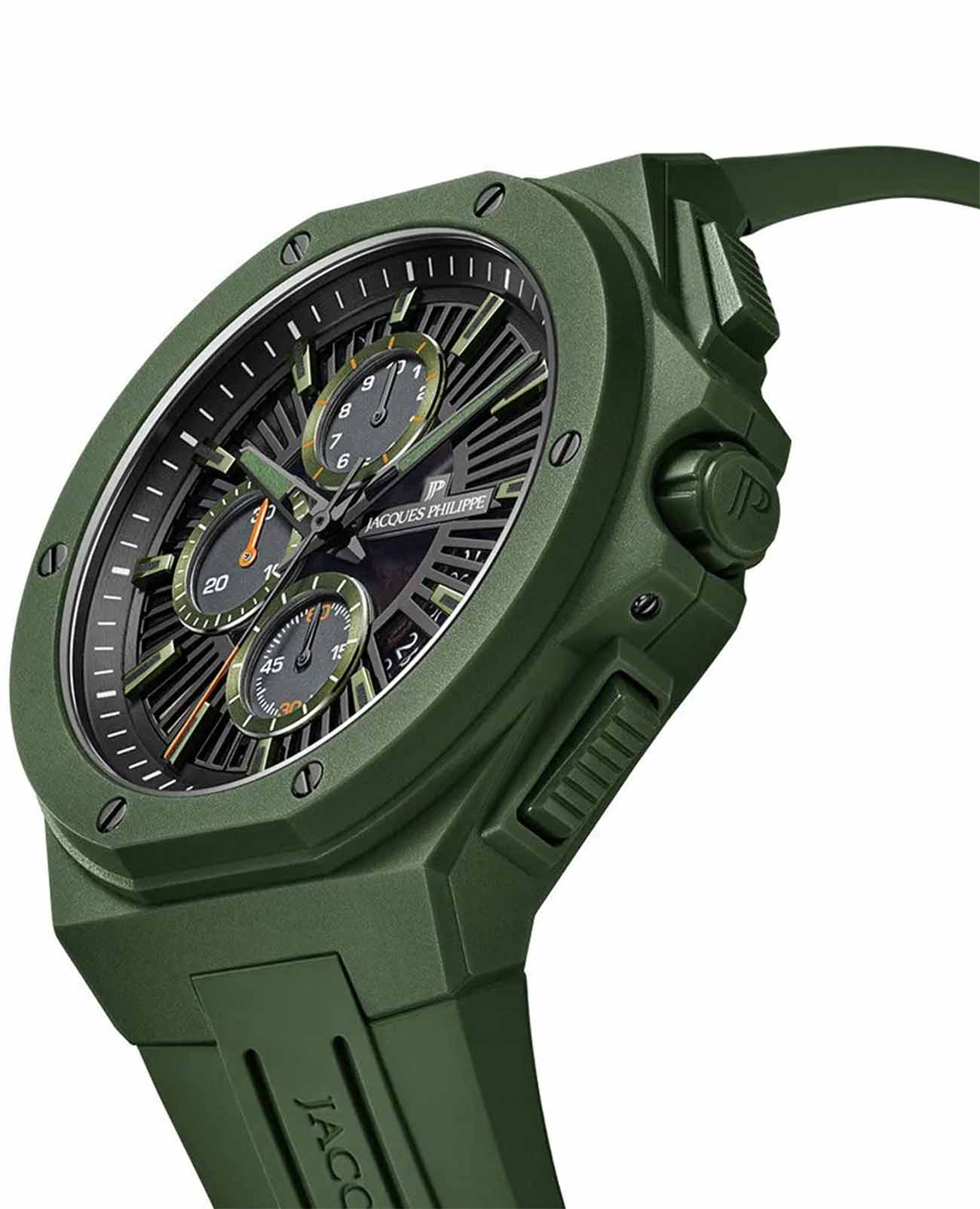 Часы Jacques Philippe JPQGC51X41X из коллекции Militia — стильные швейцарские часы с функцией хронографаХронографФункция позволяет измерять отрезки времени с особой точностью: часы, минуты, секунды. Верным признаком хронографа является наличие на циферблате 3 дополнительных окошек-счётчиков. и секундомераСекундомерСекундоме́р — прибор, способный измерять интервалы времени с точностью до долей секунды., которые сочетают в себе элегантность и современный функционал. Модель оснащена надежным кварцевым механизмом, обеспечивающим высокую точность хода. Корпус выполнен из нержавеющей стали 316L с износостойким зеленым IP-покрытиемIP-покрытиеМетод ионного напыления. Демонстрирует повышенную устойчивость к истиранию, окислению и химическим веществам. Под воздействием высокого давления и температуры около 1500°C молекулы металла надёжно соединяются с частицами корпуса часов., диаметр корпуса составляет 48 мм, толщина — 12,5 мм. Сапфировое стеклоСапфировое стеклоПрочный и надёжный материал из кристалла сапфира синтетического происхождения, характеризующийся особой твёрдостью и устойчивостью к царапинам и повреждениям. защищает часы от царапин и сохраняет прозрачность даже при активном использовании. Черный циферблат дополнен тремя дополнительными индикаторами и окошком даты в положении 4 часа, а стрелки имеют люминесцентное покрытиеЛюминесцентное покрытиеПозволяет считывать показания времени в темноте. Производители наносят на стрелки, часовые индексы, безель или поверхность циферблата светонакопительный состав, дающий холодное свечение.  для удобства чтения времени в темноте. Силиконовый браслет шириной 26 мм и длиной 19 см надежно фиксируется на запястье стандартной застежкой и обеспечивает комфорт при носке. Водозащита 5 АТМ позволяет не снимать часы при мытье рук или прогулках под дождём.