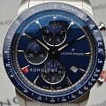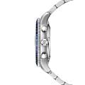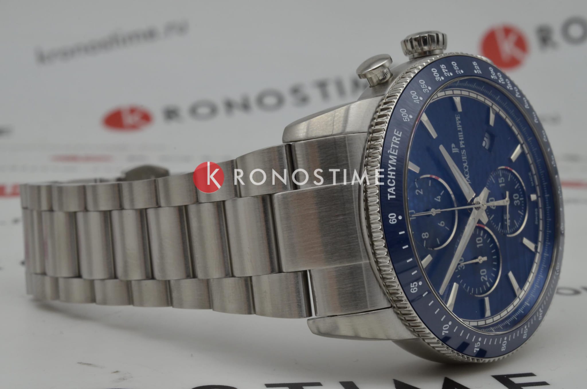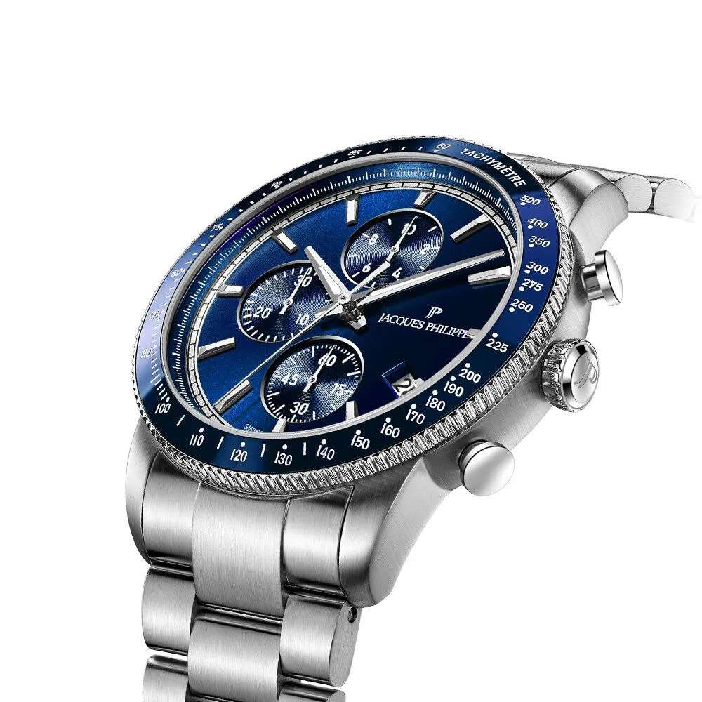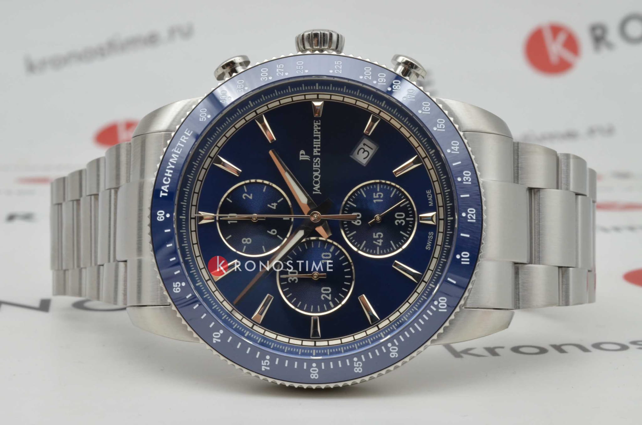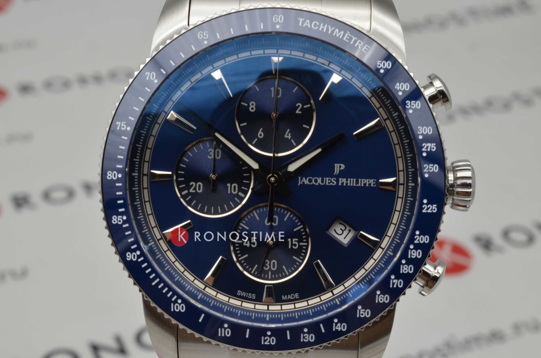 Швейцарские наручные часы Jacques Philippe JPQGC691336 сочетают в себе современный дизайн, надежность и функциональность, это стильные швейцарские часы с функцией хронографаХронографФункция позволяет измерять отрезки времени с особой точностью: часы, минуты, секунды. Верным признаком хронографа является наличие на циферблате 3 дополнительных окошек-счётчиков. и секундомераСекундомерСекундоме́р — прибор, способный измерять интервалы времени с точностью до долей секунды.. Корпус круглой формы диаметром 42 мм выполнен из прочной нержавеющей стали, а безельБезельВнешний ободок, закрепляющий стекло. В спортивных часах так называется поворотное кольцо с делениями на циферблате, выполняет роль таймера – замеряет отрезки времени на шкале. Неподвижный безель – элемент декора. Однонаправленно вращающийся безель на дайверских часах позволяет фиксировать моменты погружения и выныривания на поверхность. с элегантным синим IP-покрытиемIP-покрытиеМетод ионного напыления. Демонстрирует повышенную устойчивость к истиранию, окислению и химическим веществам. Под воздействием высокого давления и температуры около 1500°C молекулы металла надёжно соединяются с частицами корпуса часов.. Сапфировое стеклоСапфировое стеклоПрочный и надёжный материал из кристалла сапфира синтетического происхождения, характеризующийся особой твёрдостью и устойчивостью к царапинам и повреждениям. с антибликовым покрытиемАнтибликовое покрытиеСлой оксида металла в 0,13-0,3 микрон, благодаря которому стекло часов не бликует и не отражает свет. Антибликовое покрытие уменьшает отражение света в 10 раз, обеспечивая отличную читаемость показателей циферблата. надежно защищает синий циферблат от царапин и повреждений. Модель оснащена точным кварцевым механизмом, а также дополнительными функциями — тахиметромТахиметрРазмеченная шкала, располагается на ободке или безеле часов. Тахиметр позволяет рассчитать скорость на определённом участке пути, расстояние измеряется в километрах или милях. и индикатором даты, что делает часы не только стильным аксессуаром, но и практичным помощником на каждый день. Серебряный браслет шириной 22 мм удобно фиксируется на запястье с помощью застежки «бабочка»Застёжка "бабочка"Такой вид застёжки дополняется предохранителями, помогающими избежать случайного раскрытия браслета. Обладают изящным исполнением. . Стрелки имеют люминесцентное покрытиеЛюминесцентное покрытиеПозволяет считывать показания времени в темноте. Производители наносят на стрелки, часовые индексы, безель или поверхность циферблата светонакопительный состав, дающий холодное свечение. для удобства чтения времени в темноте. Водозащита 5 АТМ позволяет не снимать часы при дожде и случайных контактах с водой.