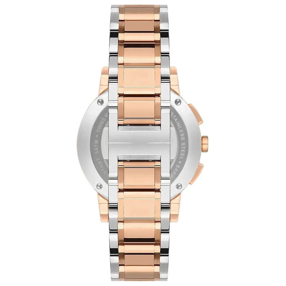 Швейцарские женские часы c хронографомХронографФункция позволяет измерять отрезки времени с особой точностью: часы, минуты, секунды. Верным признаком хронографа является наличие на циферблате 3 дополнительных окошек-счётчиков. Jacques Philippe Cosmos JPQLC323328N, кварцевый механизм с высокой точностью. Сапфировое стеклоСапфировое стеклоПрочный и надёжный материал из кристалла сапфира синтетического происхождения, характеризующийся особой твёрдостью и устойчивостью к царапинам и повреждениям. устойчивое к появлению царапин, обладающее высокой прозрачностью. Корпус часов изготовлен из нержавеющей стали с PVD-покрытиемPVDУльтратонкое покрытие наносится в технике вакуумного напыления, сочетает в себе нитрид титана особой прочности со слоем золота или оксида хрома. Несёт в себе декоративную или защитную функцию.. Класс водозащиты: 50 метров, позволит защитить корпус от случайных брызг или капель дождя. Стальной браслет с PVD-покрытиемPVDУльтратонкое покрытие наносится в технике вакуумного напыления, сочетает в себе нитрид титана особой прочности со слоем золота или оксида хрома. Несёт в себе декоративную или защитную функцию. на застёжке-бабочке с кнопкамиЗастёжка "бабочка"Такой вид застёжки дополняется предохранителями, помогающими избежать случайного раскрытия браслета. Обладают изящным исполнением. . Окошко даты находится в положении между 4 и 5 часов. Циферблат инкрустирован кристаллами.