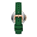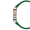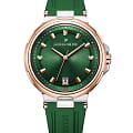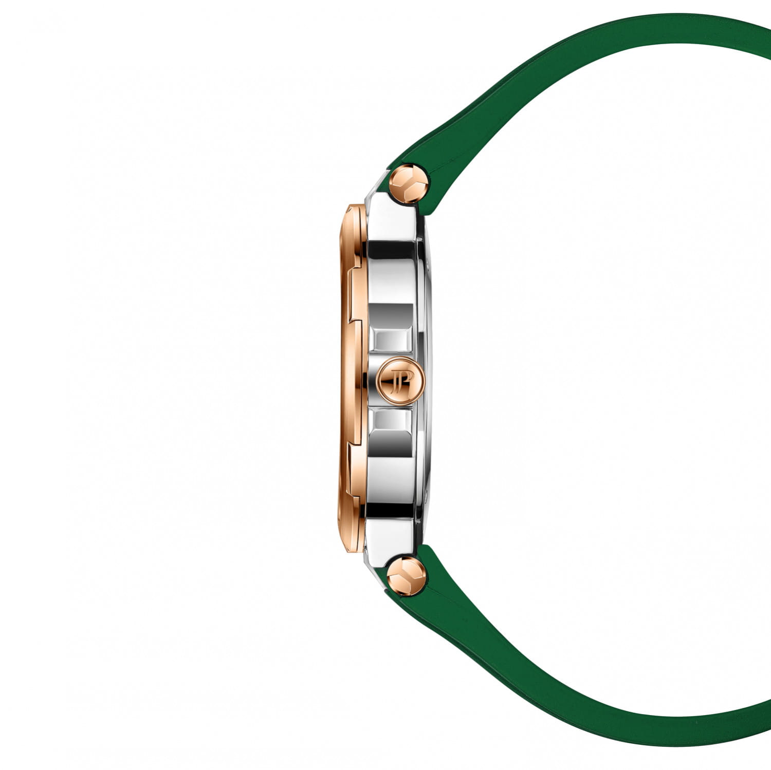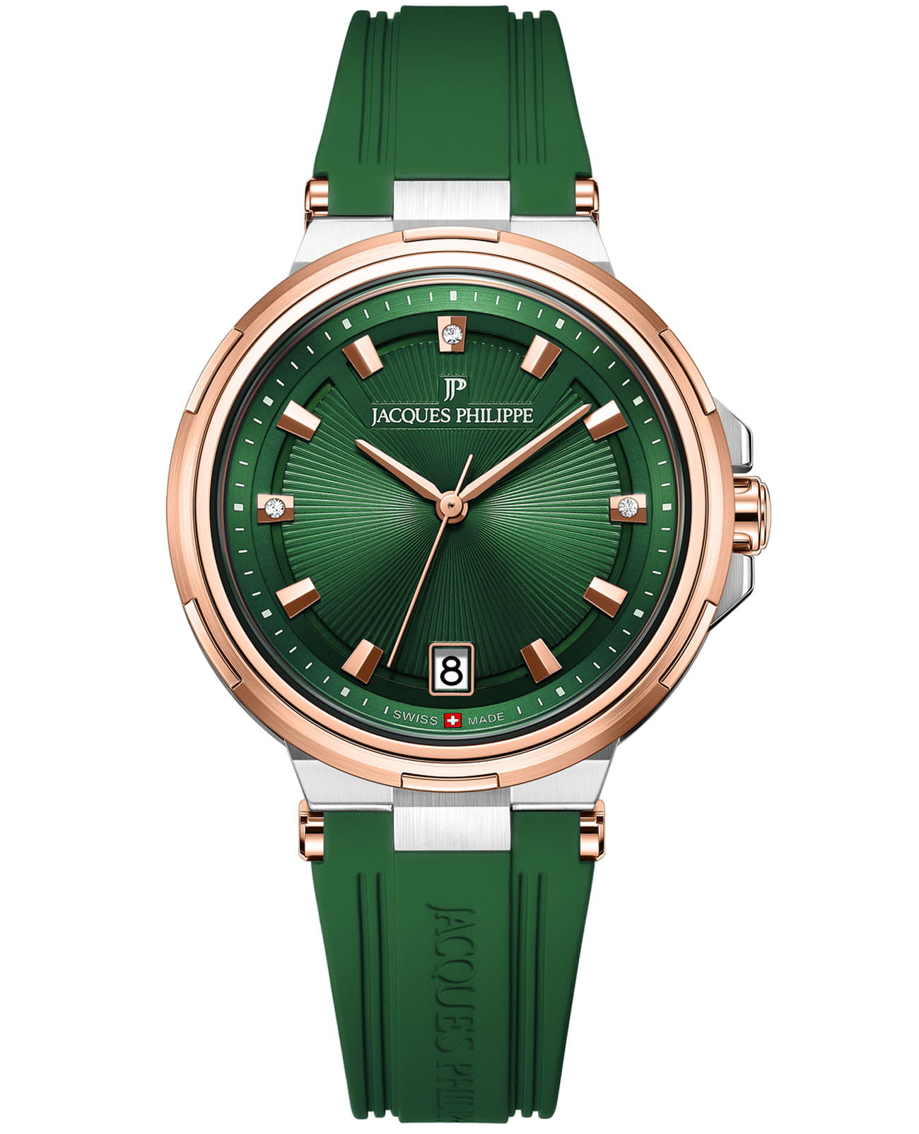 Часы Jacques Philippe JPQLS4574XX из коллекции Novellus — элегантные женские часы, сочетающие швейцарское качество и современный дизайн. Корпус диаметром 36 мм выполнен из нержавеющей стали, а зеленый циферблат защищён сапфировым стекломСапфировое стеклоПрочный и надёжный материал из кристалла сапфира синтетического происхождения, характеризующийся особой твёрдостью и устойчивостью к царапинам и повреждениям.. БезельБезельВнешний ободок, закрепляющий стекло. В спортивных часах так называется поворотное кольцо с делениями на циферблате, выполняет роль таймера – замеряет отрезки времени на шкале. Неподвижный безель – элемент декора. Однонаправленно вращающийся безель на дайверских часах позволяет фиксировать моменты погружения и выныривания на поверхность. с PVD-покрытиемPVDУльтратонкое покрытие наносится в технике вакуумного напыления, сочетает в себе нитрид титана особой прочности со слоем золота или оксида хрома. Несёт в себе декоративную или защитную функцию.. Циферблат инкрустирован кристаллами. Внутри установлен швейцарский кварцевый механизм, обеспечивающий высокую точность хода. Водозащита 50 метров (5 ATM) защищает часы от брызг и дождя. Ремень из силикона обеспечивает комфортное ношение и надёжную фиксацию на запястье. Эти часы идеально подойдут для тех, кто ценит сочетание элегантного дизайна и функциональности.