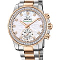 Женские швейцарские часы Jaguar Connected Lady J981/1. Сапфировое стеклоСапфировое стеклоПрочный и надёжный материал из кристалла сапфира синтетического происхождения, характеризующийся особой твёрдостью и устойчивостью к царапинам и повреждениям. устойчивое к мелким механическим повреждениям. Корпус часов изготовлен из нержавеющей стали. Стрелки и метки с люминесцентным покрытиемЛюминесцентное покрытиеПозволяет считывать показания времени в темноте. Производители наносят на стрелки, часовые индексы, безель или поверхность циферблата светонакопительный состав, дающий холодное свечение.. Класс водозащиты: 50 метров, позволит защитить корпус от случайных брызг или капель дождя. БезельБезельВнешний ободок, закрепляющий стекло. В спортивных часах так называется поворотное кольцо с делениями на циферблате, выполняет роль таймера – замеряет отрезки времени на шкале. Неподвижный безель – элемент декора. Однонаправленно вращающийся безель на дайверских часах позволяет фиксировать моменты погружения и выныривания на поверхность. с PVD-покрытиемPVDУльтратонкое покрытие наносится в технике вакуумного напыления, сочетает в себе нитрид титана особой прочности со слоем золота или оксида хрома. Несёт в себе декоративную или защитную функцию. и циферблат инкрустированы цирконием. Стальной браслет с частичным PVD-покрытиемPVDУльтратонкое покрытие наносится в технике вакуумного напыления, сочетает в себе нитрид титана особой прочности со слоем золота или оксида хрома. Несёт в себе декоративную или защитную функцию. на раскладной застёжкеРаскладная застёжкаТакой тип застёжки используется только на браслетах из металла. Она никогда не раскрывается полностью, происходит разделение на 2 и более частей. Раскладывающая застёжка снизит вероятность потери часов к минимуму.. За точный ход работы часов, из коллекции Connected, отвечает кварцевый гибридный механизм швейцарского производства со Смарт-Модулем. Данный тип механизма обеспечивает возможность подключить часы к телефону через Bluetooth и управлять большим рядом дополнительных функций на выбор с помошью приложения Jaguar. Дополнительные функции: отображение даты и дня недели, секундомер, таймер, GMT, шагомер, поиск телефона, включение/выключение звука телефона при входящих вызовах, переключение музыки, вибро-уведомления.