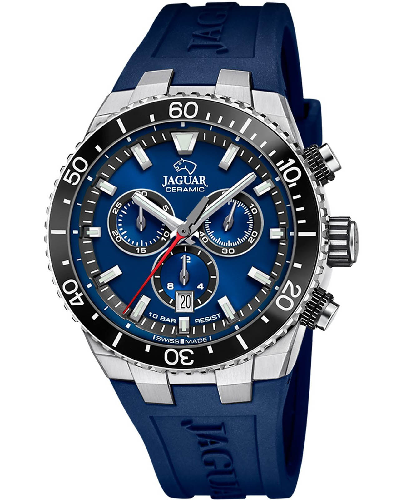 Мужские швейцарские часы-хронографХронографФункция позволяет измерять отрезки времени с особой точностью: часы, минуты, секунды. Верным признаком хронографа является наличие на циферблате 3 дополнительных окошек-счётчиков. Jaguar Ceramic J1021/1. Кварцевый швейцарский калибр Ronda 5030d. Сапфировое стеклоСапфировое стеклоПрочный и надёжный материал из кристалла сапфира синтетического происхождения, характеризующийся особой твёрдостью и устойчивостью к царапинам и повреждениям. устойчивое к мелким механическим повреждениям. Корпус часов изготовлен из нержавеющей стали. Стрелки и метки с люминесцентным покрытиемЛюминесцентное покрытиеПозволяет считывать показания времени в темноте. Производители наносят на стрелки, часовые индексы, безель или поверхность циферблата светонакопительный состав, дающий холодное свечение.. Окошко даты находится в положении 6 часов. Класс водозащиты: 100 метров, позволит плавать, нырять и заниматься другими водными видами спорта. Силиконовый ремешок на стандартной застёжке. БезельБезельВнешний ободок, закрепляющий стекло. В спортивных часах так называется поворотное кольцо с делениями на циферблате, выполняет роль таймера – замеряет отрезки времени на шкале. Неподвижный безель – элемент декора. Однонаправленно вращающийся безель на дайверских часах позволяет фиксировать моменты погружения и выныривания на поверхность. из черной высокотехнологичной керамики.