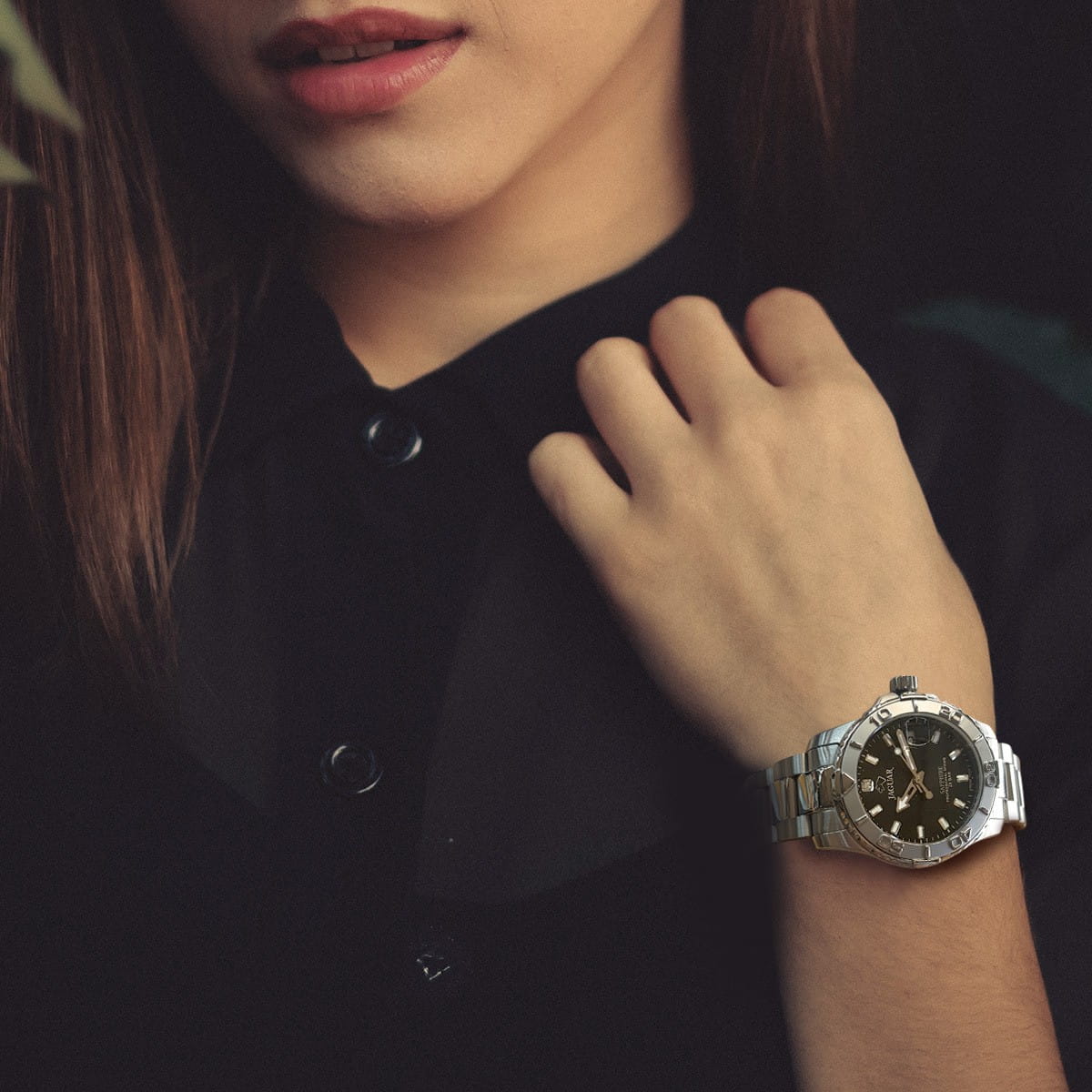 Женские швейцарские часы Jaguar Couple Diver J870/4. Кварцевый швейцарский калибр Ronda 705. Сапфировое стеклоСапфировое стеклоПрочный и надёжный материал из кристалла сапфира синтетического происхождения, характеризующийся особой твёрдостью и устойчивостью к царапинам и повреждениям. устойчивое к мелким механическим повреждениям. Корпус и браслет часов изготовлены из нержавеющей стали. Стрелки и метки с люминесцентным покрытиемЛюминесцентное покрытиеПозволяет считывать показания времени в темноте. Производители наносят на стрелки, часовые индексы, безель или поверхность циферблата светонакопительный состав, дающий холодное свечение.. Окошко даты находится в положении 3 часа. Класс водозащиты: 200 метров, позволит плавать, нырять и заниматься другими водными видами спорта. Стальной браслет на раскладной застёжкеРаскладная застёжкаТакой тип застёжки используется только на браслетах из металла. Она никогда не раскрывается полностью, происходит разделение на 2 и более частей. Раскладывающая застёжка снизит вероятность потери часов к минимуму.. Циферблат украшен кристаллом.