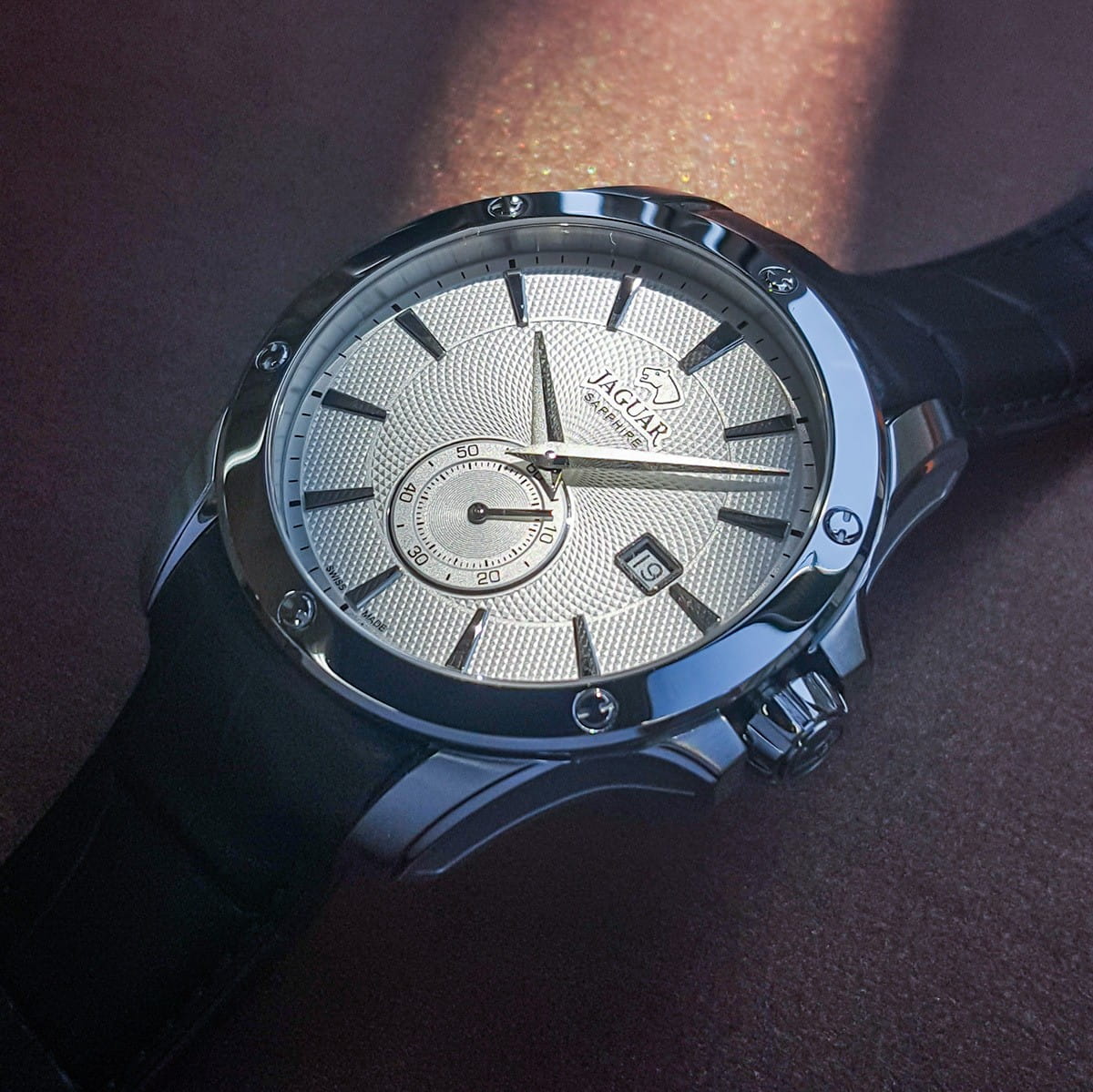 Мужские швейцарские часы Jaguar Acamar J878/1. Кварцевый швейцарский калибр RONDA 6004D. Сапфировое стеклоСапфировое стеклоПрочный и надёжный материал из кристалла сапфира синтетического происхождения, характеризующийся особой твёрдостью и устойчивостью к царапинам и повреждениям. устойчивое к мелким механическим повреждениям. Корпус часов изготовлен из нержавеющей стали. Окошко даты находится в положении 3 часа. Класс водозащиты: 100 метров, позволит плавать, нырять и заниматься другими водными видами спорта. Кожаный ремешок на стандартной застёжке.