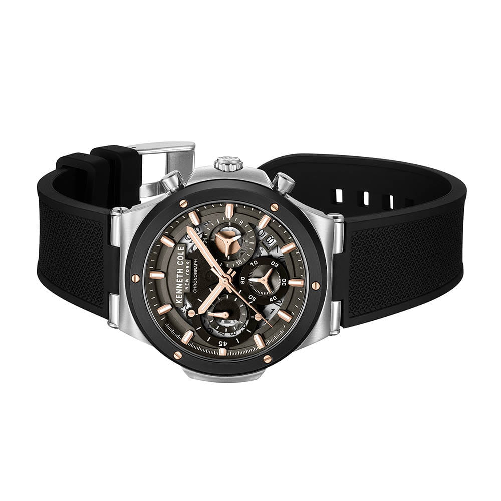 Мужские кварцевые часы Kenneth Cole KCWGO0047301 — это выразительный аксессуар с мощным характером. Корпус диаметром 45 мм выполнен из нержавеющей стали. Безель с IP-покрытиемIP-покрытиеМетод ионного напыления. Демонстрирует повышенную устойчивость к истиранию, окислению и химическим веществам. Под воздействием высокого давления и температуры около 1500°C молекулы металла надёжно соединяются с частицами корпуса часов. чёрного цвета. Циферблат серого цвета оформлен метками в виде штрихов и дополнен функциями хронографаХронографФункция позволяет измерять отрезки времени с особой точностью: часы, минуты, секунды. Верным признаком хронографа является наличие на циферблате 3 дополнительных окошек-счётчиков. и индикации даты. Стрелки и метки оснащены люминесцентным покрытиемЛюминесцентное покрытиеПозволяет считывать показания времени в темноте. Производители наносят на стрелки, часовые индексы, безель или поверхность циферблата светонакопительный состав, дающий холодное свечение., обеспечивающим хорошую читаемость в темноте. Циферблат защищён минеральным стекломМинеральное стеклоМинеральное стекло представляет собой искусственно выращенный минерал кварца. Такое стекло отличается особой устойчивостью к повреждениям и царапинам. Уступает по некоторым качествам сапфировому стеклу.. Часы оснащены силиконовым ремешком чёрного цвета с классической пряжкой. Водонепроницаемость 30 м позволяет использовать часы в повседневных условиях, защищая от случайных брызг и капель дождя. Уверенный выбор для тех, кто предпочитает крупные детали и современный стиль.