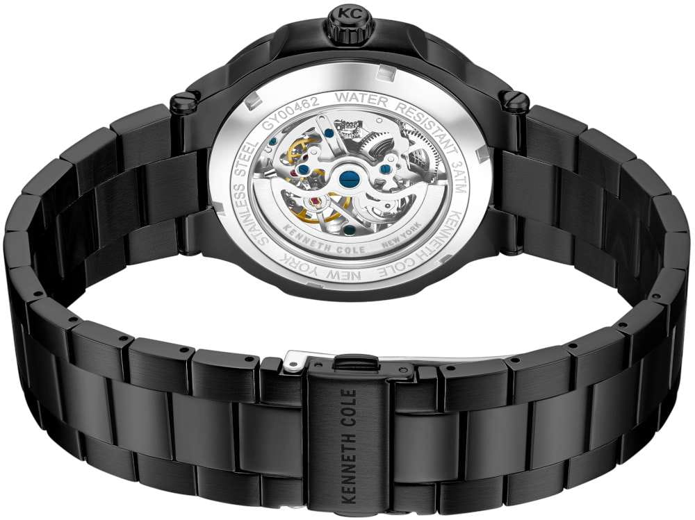 Мужские механические часы с автоподзаводом Kenneth Cole KCWGY0046202 — это выразительный аксессуар, сочетающий современный дизайн и инженерную изысканность. Корпус размером 44 мм выполнен из нержавеющей стали с PVD-покрытиемPVDУльтратонкое покрытие наносится в технике вакуумного напыления, сочетает в себе нитрид титана особой прочности со слоем золота или оксида хрома. Несёт в себе декоративную или защитную функцию.. Циферблат черного цвета частично скелетонизирован, что позволяет наблюдать за работой механизма, добавляя модели динамики и технологичности. Циферблат защищён минеральным стекломМинеральное стеклоМинеральное стекло представляет собой искусственно выращенный минерал кварца. Такое стекло отличается особой устойчивостью к повреждениям и царапинам. Уступает по некоторым качествам сапфировому стеклу. и оформлен метками в виде штрихов. Стрелки и метки оснащены люминесцентным покрытиемЛюминесцентное покрытиеПозволяет считывать показания времени в темноте. Производители наносят на стрелки, часовые индексы, безель или поверхность циферблата светонакопительный состав, дающий холодное свечение., обеспечивающим хорошую читаемость в темноте. Часы оснащены стальным браслетом с PVD-покрытиемPVDУльтратонкое покрытие наносится в технике вакуумного напыления, сочетает в себе нитрид титана особой прочности со слоем золота или оксида хрома. Несёт в себе декоративную или защитную функцию. и раскладной застёжкойРаскладная застёжкаТакой тип застёжки используется только на браслетах из металла. Она никогда не раскрывается полностью, происходит разделение на 2 и более частей. Раскладывающая застёжка снизит вероятность потери часов к минимуму.. Водонепроницаемость 30 м позволяет использовать часы в повседневных условиях, защищая от случайных брызг и капель дождя. Сочетание строгого стиля и детального исполнения делает эти часы заметным элементом образа.