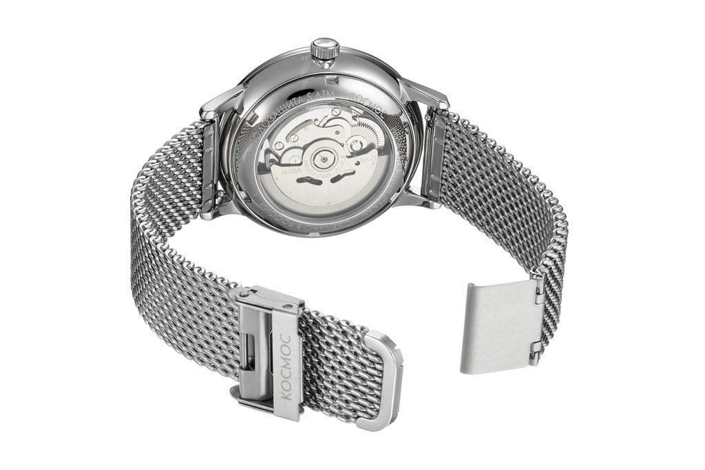 Российские мужские механические часы Космос K 043.10.30 с автоподзаводом оснащены корпусом из нержавеющей стали 316L диаметром 41 мм и защищены минеральным стекломМинеральное стеклоМинеральное стекло представляет собой искусственно выращенный минерал кварца. Такое стекло отличается особой устойчивостью к повреждениям и царапинам. Уступает по некоторым качествам сапфировому стеклу.. Циферблат песочного цвета с коричневыми и золотыми элементами дополнен функциями отображения даты и дня недели. Заводная головка декорирована логотипом бренда в виде стилизованного изображения планеты. Часы имеют водонепроницаемость 50 метров, позволит защитить корпус от случайных брызг или капель дождя. Модель комплектуется браслетом из нержавеющей стали 316L с миланским плетением на раскладном замкеРаскладной замокДанный вариант застежки используется только на часах с металлическим браслетом. Отличительная особенность такого крепления в том, что длина браслета становится универсальной и вы можете самостоятельно отрегулировать нужный вам размер – застежка просто двигается по браслету часов.. Специальные крепежи позволяют легко заменить браслет на часах самостоятельно. Прочный корпус и надежный механизм делают эти часы универсальным аксессуаром для повседневного использования. Уникальный дизайн и высокое качество материалов подчеркивают индивидуальность владельца.