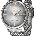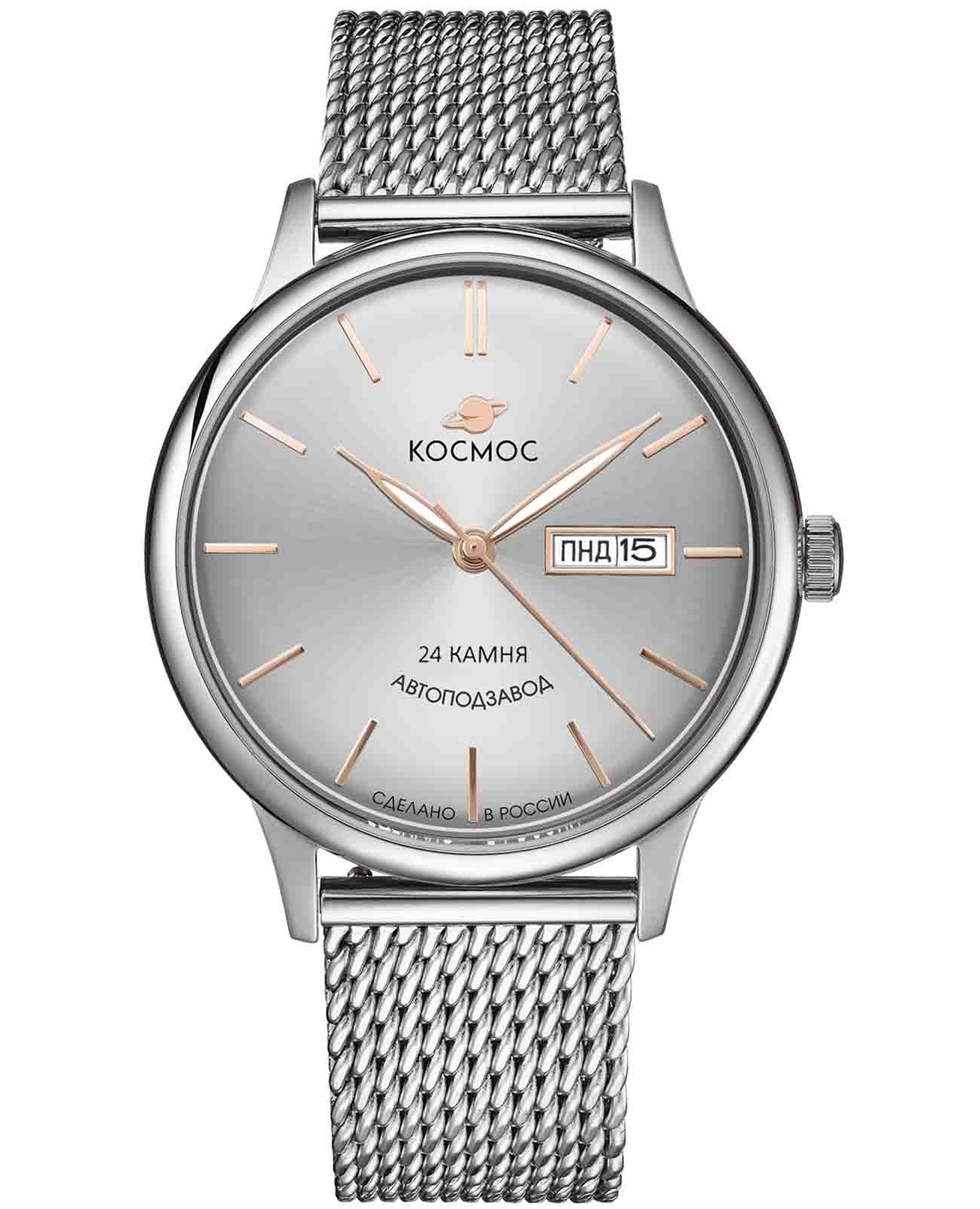 Российские мужские механические часы Космос K 043.10.32 с автоподзаводом оснащены корпусом из нержавеющей стали 316L диаметром 41 мм и защищены минеральным стекломМинеральное стеклоМинеральное стекло представляет собой искусственно выращенный минерал кварца. Такое стекло отличается особой устойчивостью к повреждениям и царапинам. Уступает по некоторым качествам сапфировому стеклу.. Дополнен функциями отображения даты и дня недели. Заводная головка декорирована логотипом бренда в виде стилизованного изображения планеты. Стрелки с люминесцентным покрытиемЛюминесцентное покрытиеПозволяет считывать показания времени в темноте. Производители наносят на стрелки, часовые индексы, безель или поверхность циферблата светонакопительный состав, дающий холодное свечение. обеспечивают хорошую видимость в темное время суток. Часы имеют водонепроницаемость 50 метров, позволит защитить корпус от случайных брызг или капель дождя. Модель комплектуется браслетом из нержавеющей стали 316L с миланским плетением на раскладном замкеРаскладной замокДанный вариант застежки используется только на часах с металлическим браслетом. Отличительная особенность такого крепления в том, что длина браслета становится универсальной и вы можете самостоятельно отрегулировать нужный вам размер – застежка просто двигается по браслету часов.. Специальные крепежи позволяют легко заменить браслет на часах самостоятельно. Прочный корпус и надежный механизм делают эти часы универсальным аксессуаром для повседневного использования. Уникальный дизайн и высокое качество материалов подчеркивают индивидуальность владельца.
