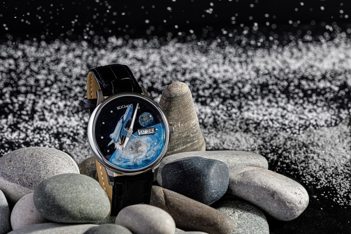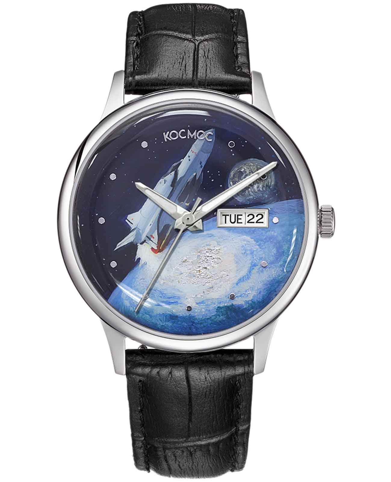 Российские механические часы Космос K 043.1 – Буран с автоподзаводом созданы в единственном экземпляре и представляют собой уникальный аксессуар, вызывающий гордость за качество отечественного производства. Круглый корпус из нержавеющей стали 316L диаметром 41 мм и толщиной 14 мм защищен минеральным стекломМинеральное стеклоМинеральное стекло представляет собой искусственно выращенный минерал кварца. Такое стекло отличается особой устойчивостью к повреждениям и царапинам. Уступает по некоторым качествам сапфировому стеклу.. Модель оснащена прозрачной задней крышкой и завинчивающейся заводной головкой, что обеспечивает дополнительную надежность механизма. Синий циферблат с голубыми элементами дополнен функциями отображения даты и дня недели. Часы имеют класс водозащиты 50 метров, позволит защитить корпус от случайных брызг или капель дождя. Модель комплектуется кожаным ремешком на стандартной застежке. Превосходное качество материалов и уникальный дизайн делают эти часы идеальным выбором для ценителей эксклюзивных аксессуаров с историческим смыслом.
