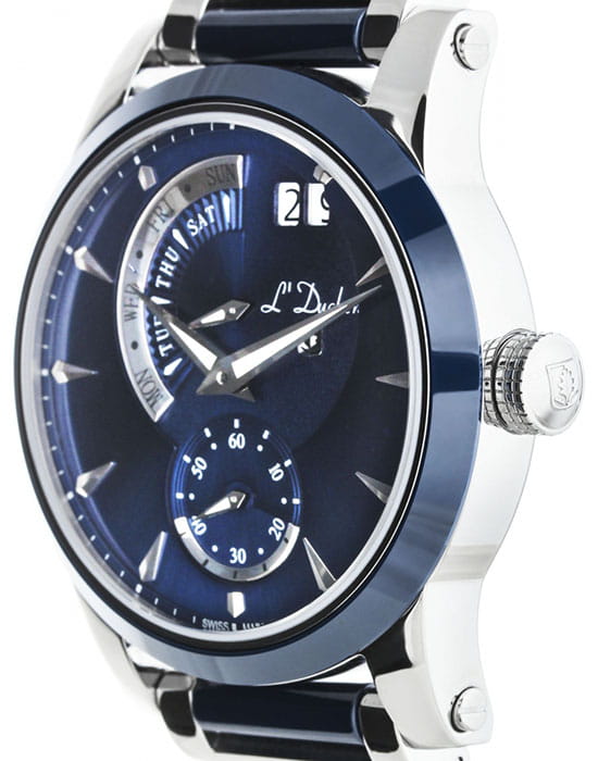 Мужские швейцарские часы L'Duchen Aerostat D 237.30.31, кварцевый механизм с высокой точностью. Сапфировое стеклоСапфировое стеклоПрочный и надёжный материал из кристалла сапфира синтетического происхождения, характеризующийся особой твёрдостью и устойчивостью к царапинам и повреждениям. устойчивое к появлению царапин, обладающее высокой прозрачностью. Корпус часов выполнен из нержавеющей стали. БезельБезельВнешний ободок, закрепляющий стекло. В спортивных часах так называется поворотное кольцо с делениями на циферблате, выполняет роль таймера – замеряет отрезки времени на шкале. Неподвижный безель – элемент декора. Однонаправленно вращающийся безель на дайверских часах позволяет фиксировать моменты погружения и выныривания на поверхность. из керамики. Стрелки с люминесцентным покрытиемЛюминесцентное покрытиеПозволяет считывать показания времени в темноте. Производители наносят на стрелки, часовые индексы, безель или поверхность циферблата светонакопительный состав, дающий холодное свечение.. Класс водозащиты: 100 метров, позволит плавать, нырять и заниматься другими водными видами спорта. Стальной браслет с керамическими вставками на застёжке «бабочка» с кнопкамиЗастёжка "бабочка"Такой вид застёжки дополняется предохранителями, помогающими избежать случайного раскрытия браслета. Обладают изящным исполнением. .