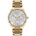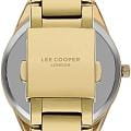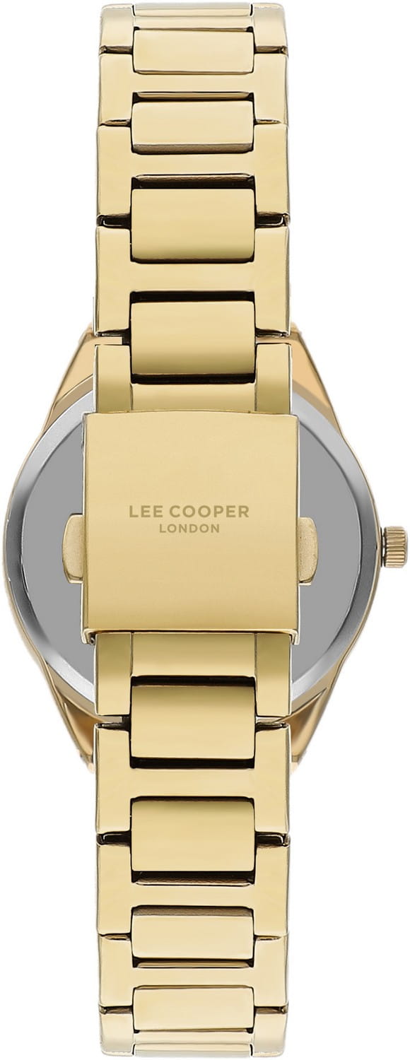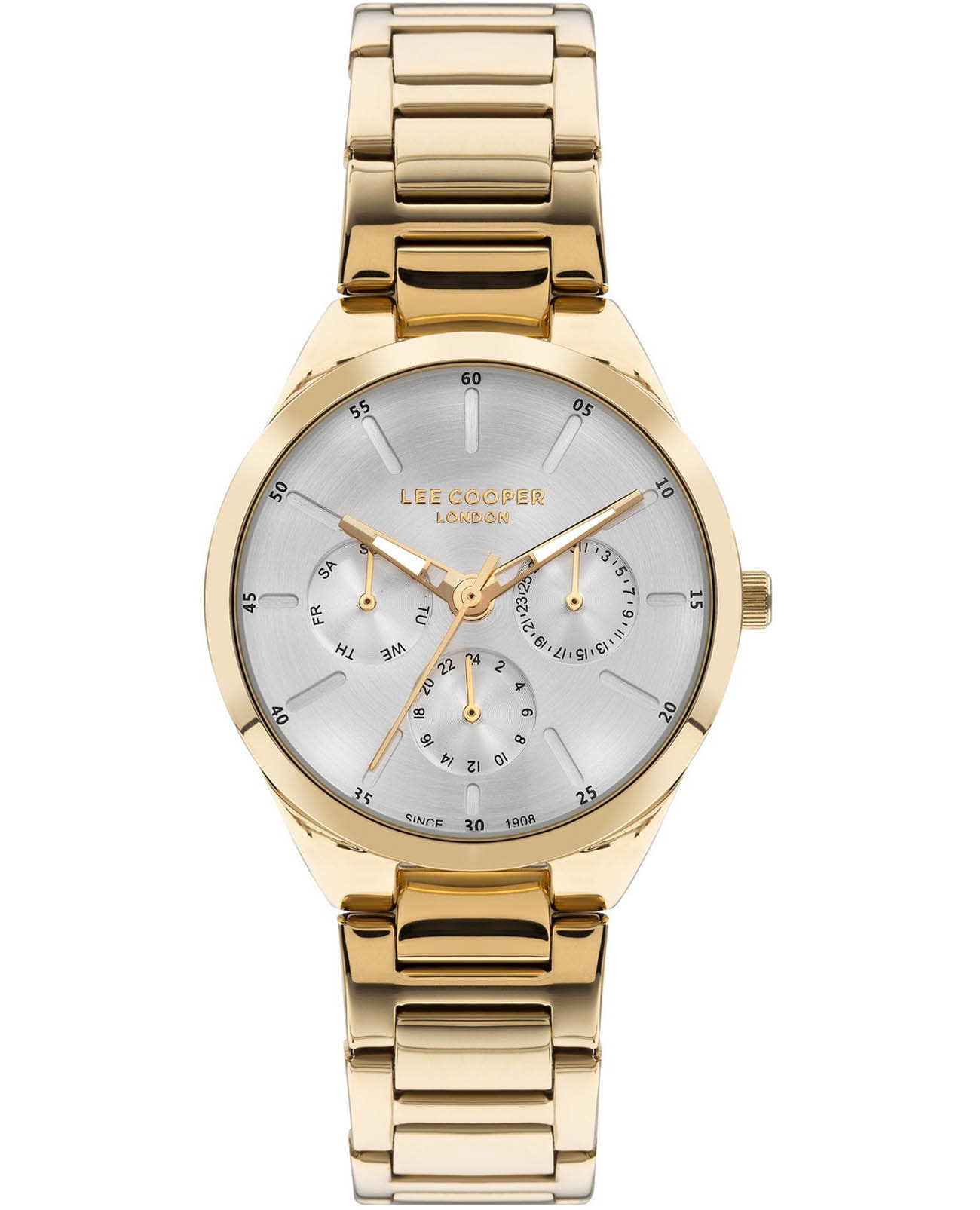 Женские часы Lee Cooper LC07643.130 — это стильное сочетание элегантности и современного дизайна. Круглый корпус диаметром 36 мм выполнен из суперметалла с IP-покрытиемIP-покрытиеМетод ионного напыления. Демонстрирует повышенную устойчивость к истиранию, окислению и химическим веществам. Под воздействием высокого давления и температуры около 1500°C молекулы металла надёжно соединяются с частицами корпуса часов. золотого цвета, придающий модели особый блеск. Серебристый циферблат защищен минеральным стекломМинеральное стеклоМинеральное стекло представляет собой искусственно выращенный минерал кварца. Такое стекло отличается особой устойчивостью к повреждениям и царапинам. Уступает по некоторым качествам сапфировому стеклу., обеспечивающим устойчивость к царапинам. Часы оснащены надежным кварцевым механизмом, а стальной браслет с IP-покрытиемIP-покрытиеМетод ионного напыления. Демонстрирует повышенную устойчивость к истиранию, окислению и химическим веществам. Под воздействием высокого давления и температуры около 1500°C молекулы металла надёжно соединяются с частицами корпуса часов. на раскладной застёжкеРаскладная застёжкаТакой тип застёжки используется только на браслетах из металла. Она никогда не раскрывается полностью, происходит разделение на 2 и более частей. Раскладывающая застёжка снизит вероятность потери часов к минимуму. гарантирует комфортную посадку на запястье. Мультифункциональная модель с индикацией даты, дня недели, с дополнительным 24-х часовым индикатором. Стрелки с люминесцентным покрытиемЛюминесцентное покрытиеПозволяет считывать показания времени в темноте. Производители наносят на стрелки, часовые индексы, безель или поверхность циферблата светонакопительный состав, дающий холодное свечение. позволяют легко считывать время даже в условиях недостаточного освещения. Водозащита 30 метров защищает модель от случайных брызг и дождя. Lee Cooper  — отличный выбор для тех, кто ценит утонченность и качество.