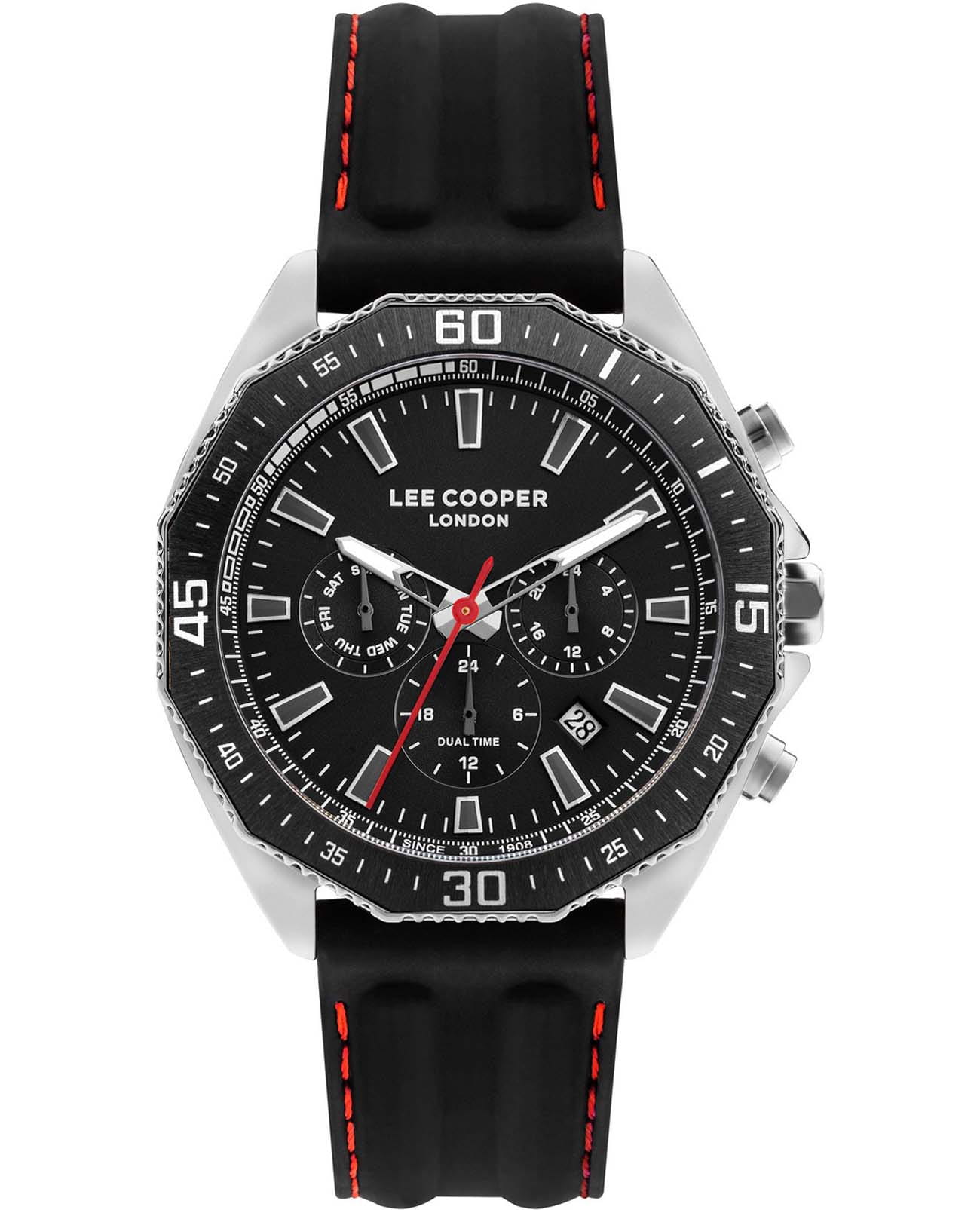 Мужские часы Lee Cooper LC07848.351 выполнены в классическом стиле и сочетают строгий дизайн с надёжным механизмом. Модель оснащена кварцевым механизмом, обеспечивающим точность хода и минимальное обслуживание. Корпус имеет размер 45 мм, изготовлен из суперметалла с безелемБезельВнешний ободок, закрепляющий стекло. В спортивных часах так называется поворотное кольцо с делениями на циферблате, выполняет роль таймера – замеряет отрезки времени на шкале. Неподвижный безель – элемент декора. Однонаправленно вращающийся безель на дайверских часах позволяет фиксировать моменты погружения и выныривания на поверхность. с IP-покрытиемIP-покрытиеМетод ионного напыления. Демонстрирует повышенную устойчивость к истиранию, окислению и химическим веществам. Под воздействием высокого давления и температуры около 1500°C молекулы металла надёжно соединяются с частицами корпуса часов.. Циферблат черного цвета дополнен индексами для чёткого отсчёта времени, а также функциями отображения даты, дня недели, 24-часового индикатора и второго часового поясаВторой часовой поясФункция, позволяющая отображать время двух часовых поясов одновременно.. Защиту циферблата обеспечивает минеральное стеклоМинеральное стеклоМинеральное стекло представляет собой искусственно выращенный минерал кварца. Такое стекло отличается особой устойчивостью к повреждениям и царапинам. Уступает по некоторым качествам сапфировому стеклу., устойчивое к мелким механическим повреждениям. Циферблат украшен стрелками и метками с люминесцентным покрытиемЛюминесцентное покрытиеПозволяет считывать показания времени в темноте. Производители наносят на стрелки, часовые индексы, безель или поверхность циферблата светонакопительный состав, дающий холодное свечение., гармонично дополняющим общий дизайн модели. Ремень из каучука оснащен стандартной застежкой, обеспечивающим комфортное и безопасное ношение. Водозащита 5 АТМ позволяет использовать часы в повседневных условиях без риска повреждения от случайных брызг воды. Это сочетание классического дизайна, прочности материалов и качества исполнения для уверенных в себе мужчин.