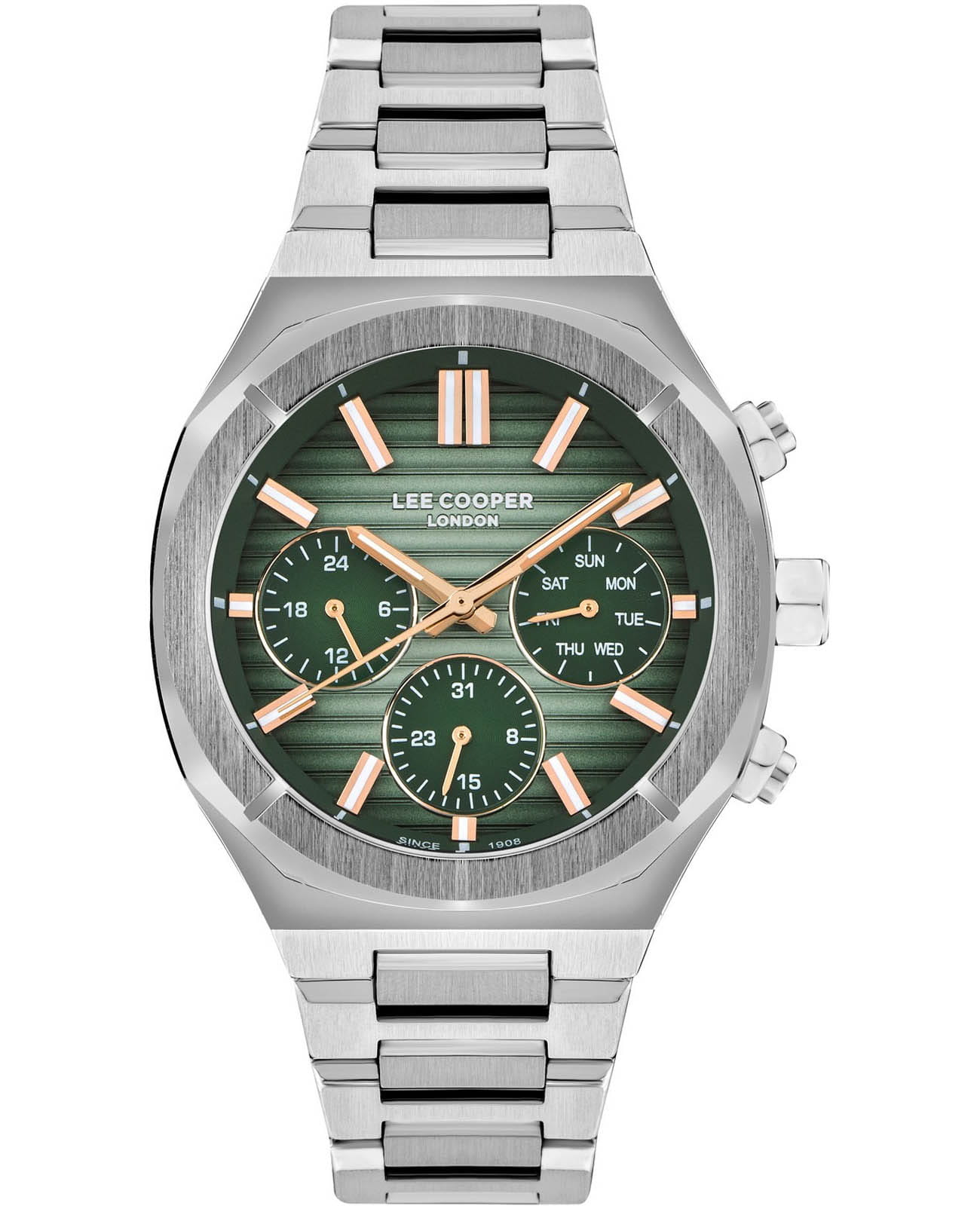 Мужские часы Lee Cooper LC07959.370 с корпусом 43 мм, выполненным из суперметалла, сочетают современный стиль и надежность. Зеленый циферблат дополняет элегантный дизайн, а минеральное стеклоМинеральное стеклоМинеральное стекло представляет собой искусственно выращенный минерал кварца. Такое стекло отличается особой устойчивостью к повреждениям и царапинам. Уступает по некоторым качествам сапфировому стеклу. защищает его от царапин и повреждений. Точный кварцевый механизм обеспечивает стабильную работу. Функциональность модели расширена за счёт индикации даты, дня недели и 24-часового формата времени. Водозащита 50 м защищает от случайных брызг. Стальной браслет с раскладной застёжкойРаскладная застёжкаТакой тип застёжки используется только на браслетах из металла. Она никогда не раскрывается полностью, происходит разделение на 2 и более частей. Раскладывающая застёжка снизит вероятность потери часов к минимуму., что гарантирует удобную посадку и надёжную фиксацию.