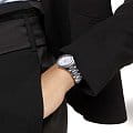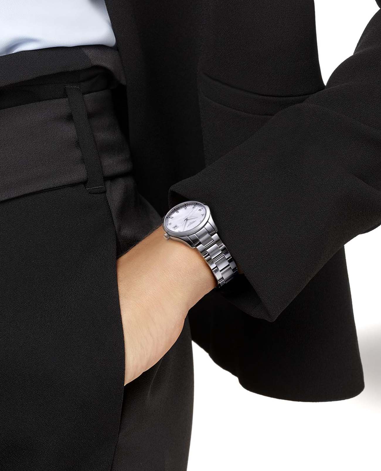 Белый перламутровый циферблат декорирован 11 бриллиантами общим весом 0,055 карата. Корпус из стали 316L защищает швейцарский кварцевый механизм L156 от повреждений. Сапфировое стекло дополнено многослойным . Функции: календарь, индикатор EOLEOLПредставляет собой систему, уведомляющую владельца часов о необходимости замены элемента питания. За 2 недели до полного разряда батарейки секундная стрелка перестаёт ходить чётко и начинает перепрыгивать на 3-4 деления..