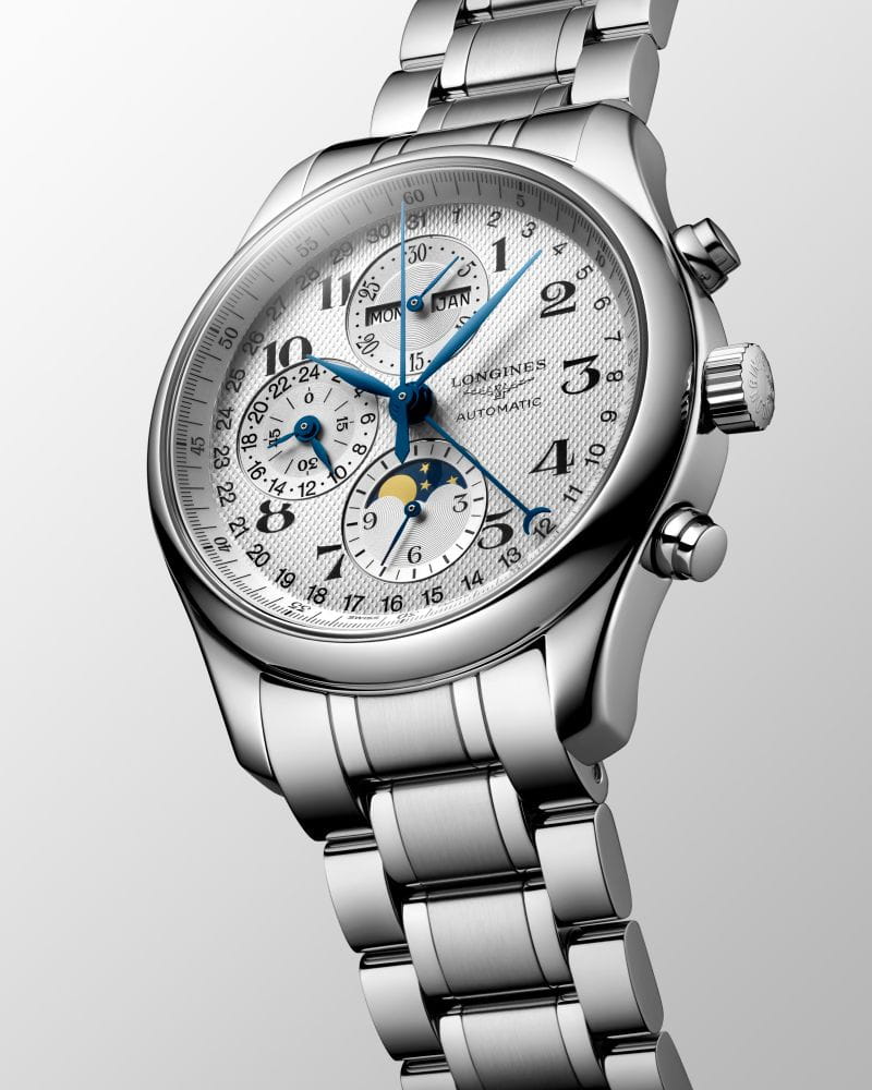 Мужские швейцарские механические часы-хронографХронографФункция позволяет измерять отрезки времени с особой точностью: часы, минуты, секунды. Верным признаком хронографа является наличие на циферблате 3 дополнительных окошек-счётчиков. с автоподзаводом Longines Master Collection L2.773.4.78.6. Сапфировое стеклоСапфировое стеклоПрочный и надёжный материал из кристалла сапфира синтетического происхождения, характеризующийся особой твёрдостью и устойчивостью к царапинам и повреждениям. устойчивое к появлению царапин, обладающее высокой прозрачностью. Корпус часов изготовлен из нержавеющей стали. Автоматический механизм с частотой баланса 28 800 полуколебаний в час и запасом хода, которого хватает примерно на 66 часов работы. Часы, минуты, малая секундная стрелка с 24-часовым индикатором в положении «9 часов». Дату показывает центральная стрелка с серповидным наконечником. Указатель фаз Луны в положении «6 часов». Класс водозащиты: 30 метров, позволит защитить корпус от случайных брызг или капель дождя. Стальной браслет на застёжке «бабочка» с кнопкамиЗастёжка "бабочка"Такой вид застёжки дополняется предохранителями, помогающими избежать случайного раскрытия браслета. Обладают изящным исполнением. .