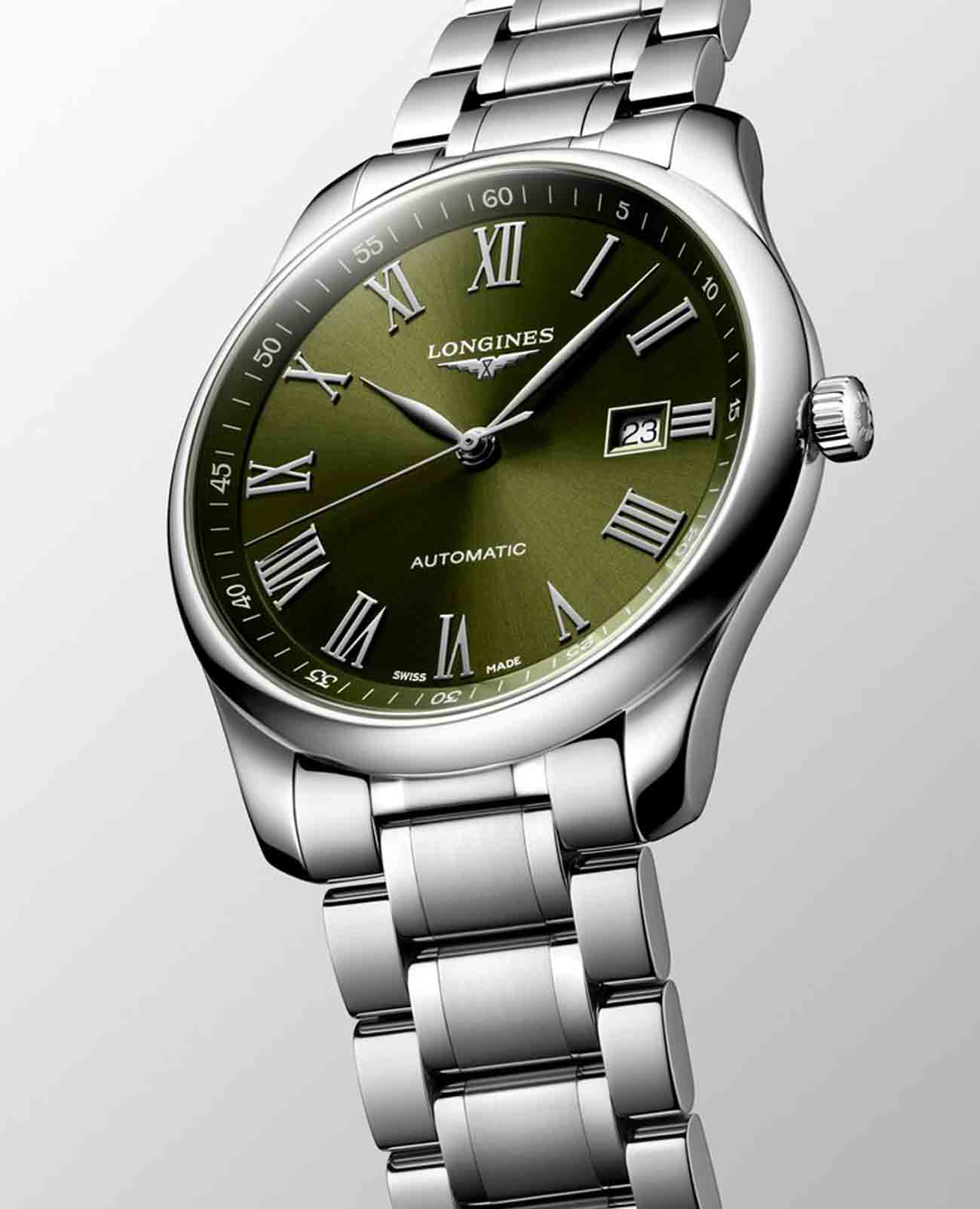 Часы Longines Master Collection Automatic (артикул L28934096) сочетают в себе классический дизайн и современные технологии, отражая богатое часовое наследие Longines. Корпус диаметром 42 мм выполнен из нержавеющей стали с водозащитой до 3 бар (30 метров). Зелёный циферблат с солнечным узором оснащён накладными римскими цифрами, стрелками с родиевым покрытием и окошком даты в положении «3 часа». Циферблат защищён сапфировым стекломСапфировое стеклоПрочный и надёжный материал из кристалла сапфира синтетического происхождения, характеризующийся особой твёрдостью и устойчивостью к царапинам и повреждениям. с антибликовым покрытием с обеих сторон.