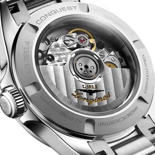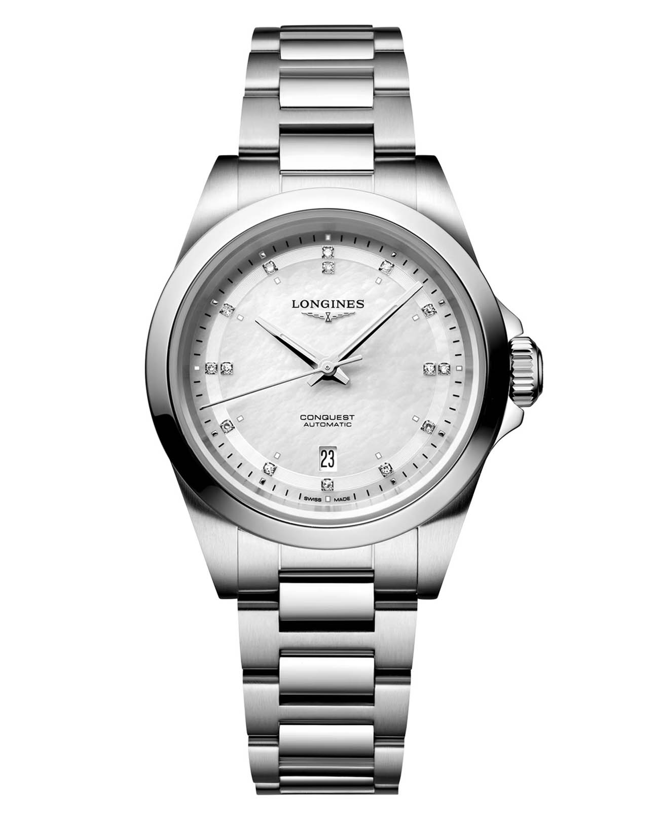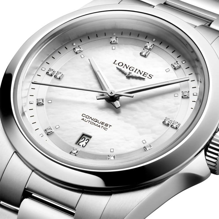 Швейцарские автоматические часы Conquest L3.320.4.87.6 с круглым корпусом из нержавеющей стали диаметром 30 мм оснащены механизмом калибра L592 с автоподзаводом, частотой 28'800 полуколебаний в час и запасом хода около 45 часов благодаря монокристаллической кремниевой спирали баланса. Циферблат защищен сапфировым стекломСапфировое стеклоПрочный и надёжный материал из кристалла сапфира синтетического происхождения, характеризующийся особой твёрдостью и устойчивостью к царапинам и повреждениям.. Прозрачная задняя крышка также выполнена из сапфирового стекла, позволяя наблюдать за работой механизма. Часы имеют водонепроницаемость до 10 бар, позволит плавать, нырять и заниматься другими водными видами спорта. Белый перламутровый циферблат украшен 15 бриллиантами группы Top Wesselton VS-SI общим весом 0.037 карата, а посеребренные полированные стрелки с люминесцентным покрытиемЛюминесцентное покрытиеПозволяет считывать показания времени в темноте. Производители наносят на стрелки, часовые индексы, безель или поверхность циферблата светонакопительный состав, дающий холодное свечение. Swiss Super-LumiNova® обеспечивают хорошую видимость в любое время суток. Удобный стальной браслет оснащён застёжкой бабочкойЗастёжка "бабочка"Такой вид застёжки дополняется предохранителями, помогающими избежать случайного раскрытия браслета. Обладают изящным исполнением. , обеспечивающей надёжную фиксацию часов на запястье и комфорт даже при длительном ношении.