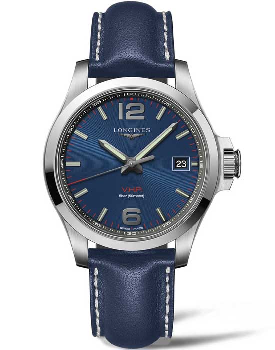 Мужские швейцарские часы Longines Conquest V.H.P. L3.716.4.96.7 станут гармоничным завершением образа. Синий ремешок из кожи стильно смотрится на запястье. Швейцарский кварцевый механизм L288 демонстрирует абсолютную точность хода. Устойчивое к царапинам сапфировое стекло имеет антибликовое покрытиеАнтибликовое покрытиеСлой оксида металла в 0,13-0,3 микрон, благодаря которому стекло часов не бликует и не отражает свет. Антибликовое покрытие уменьшает отражение света в 10 раз, обеспечивая отличную читаемость показателей циферблата.. Функции: вечный календарь, индикатор EOLEOLПредставляет собой систему, уведомляющую владельца часов о необходимости замены элемента питания. За 2 недели до полного разряда батарейки секундная стрелка перестаёт ходить чётко и начинает перепрыгивать на 3-4 деления., хронограф. Производство и сборка: Швейцария.