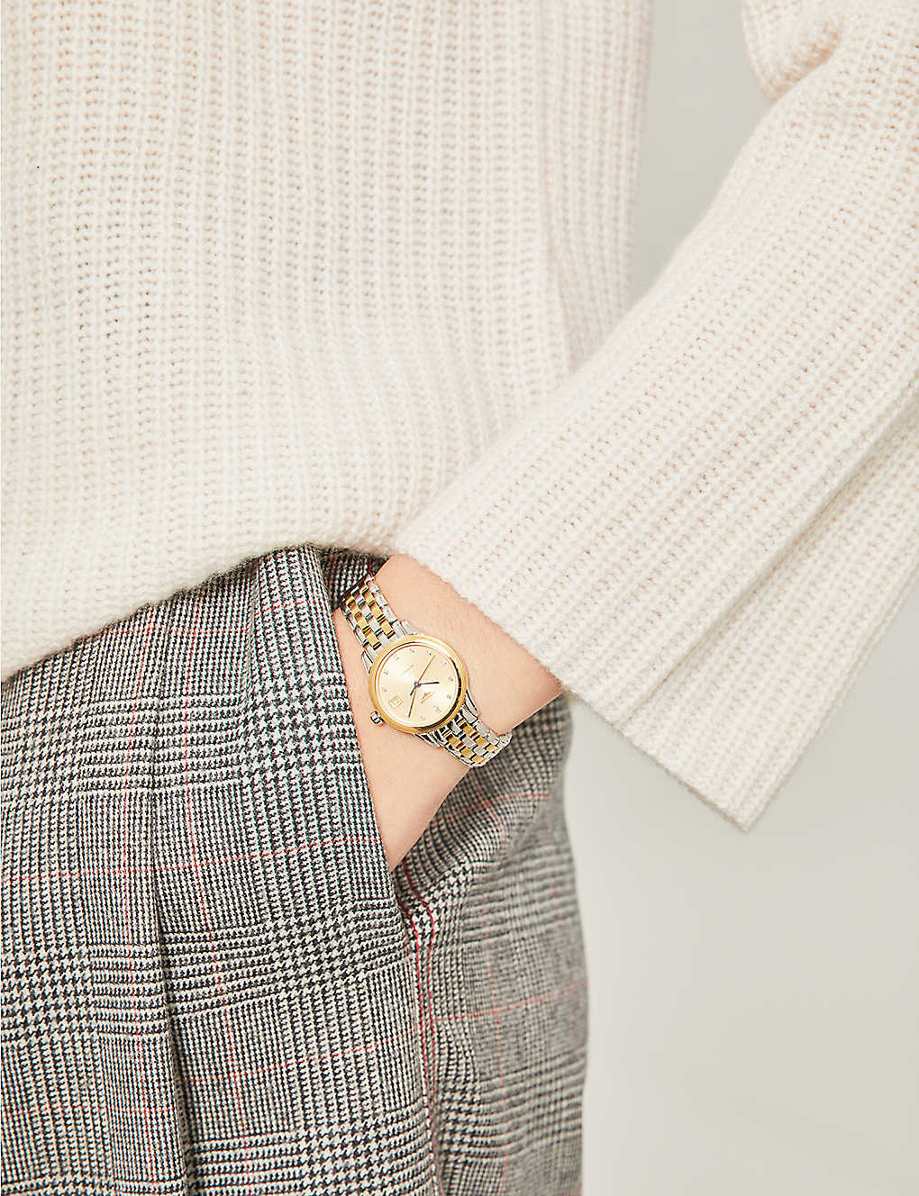 Циферблат с 12 бриллиантами группы Top Wesselton VS-SI общим весом 0.034 карата, придаёт часам особое сияние и шик. Сапфировое стеклоСапфировое стеклоПрочный и надёжный материал из кристалла сапфира синтетического происхождения, характеризующийся особой твёрдостью и устойчивостью к царапинам и повреждениям. с антибликовым покрытиемАнтибликовое покрытиеСлой оксида металла в 0,13-0,3 микрон, благодаря которому стекло часов не бликует и не отражает свет. Антибликовое покрытие уменьшает отражение света в 10 раз, обеспечивая отличную читаемость показателей циферблата. защищает циферблат от царапин и улучшает читаемость показаний. Браслет из нержавеющей стали с частичным с PVD-покрытиемPVDУльтратонкое покрытие наносится в технике вакуумного напыления, сочетает в себе нитрид титана особой прочности со слоем золота или оксида хрома. Несёт в себе декоративную или защитную функцию. на застёжкой «бабочка»Застёжка "бабочка"Такой вид застёжки дополняется предохранителями, помогающими избежать случайного раскрытия браслета. Обладают изящным исполнением. , оснащённой кнопочной системой открытия, обеспечивает комфорт и безопасность при ношении. Окошко даты в положении 3 часа добавляет часам функциональности. Водонепроницаемость часов составляет 30 метров, что позволяет носить их в повседневной жизни без опасений за их сохранность.