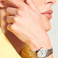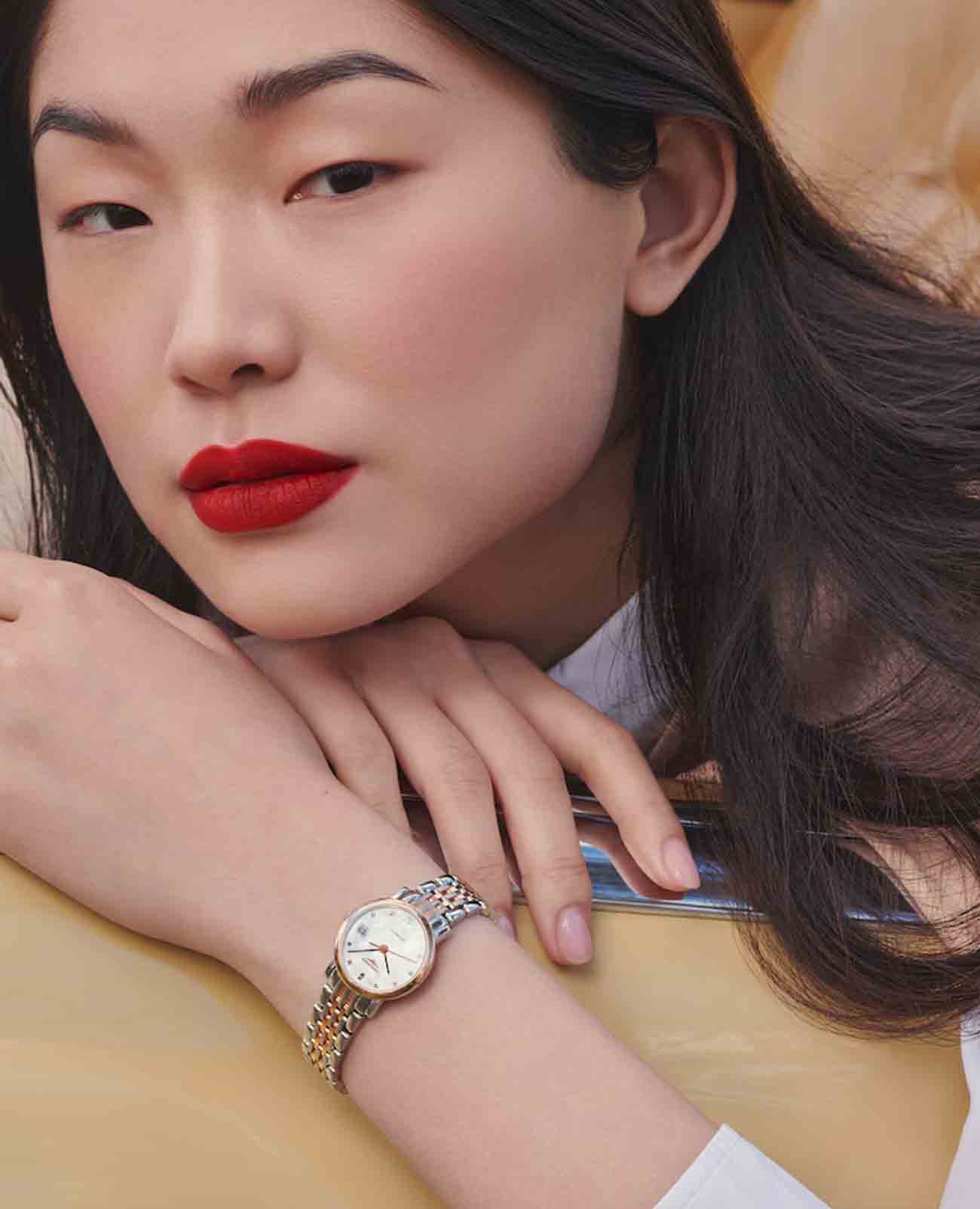 , что придает им неповторимый шарм и утонченность. Бриллиантовые индексы из 13 камней, общим весом в 0,029 карата, элегантно обрамляют перламутровый циферблат, создавая завораживающий эффект.