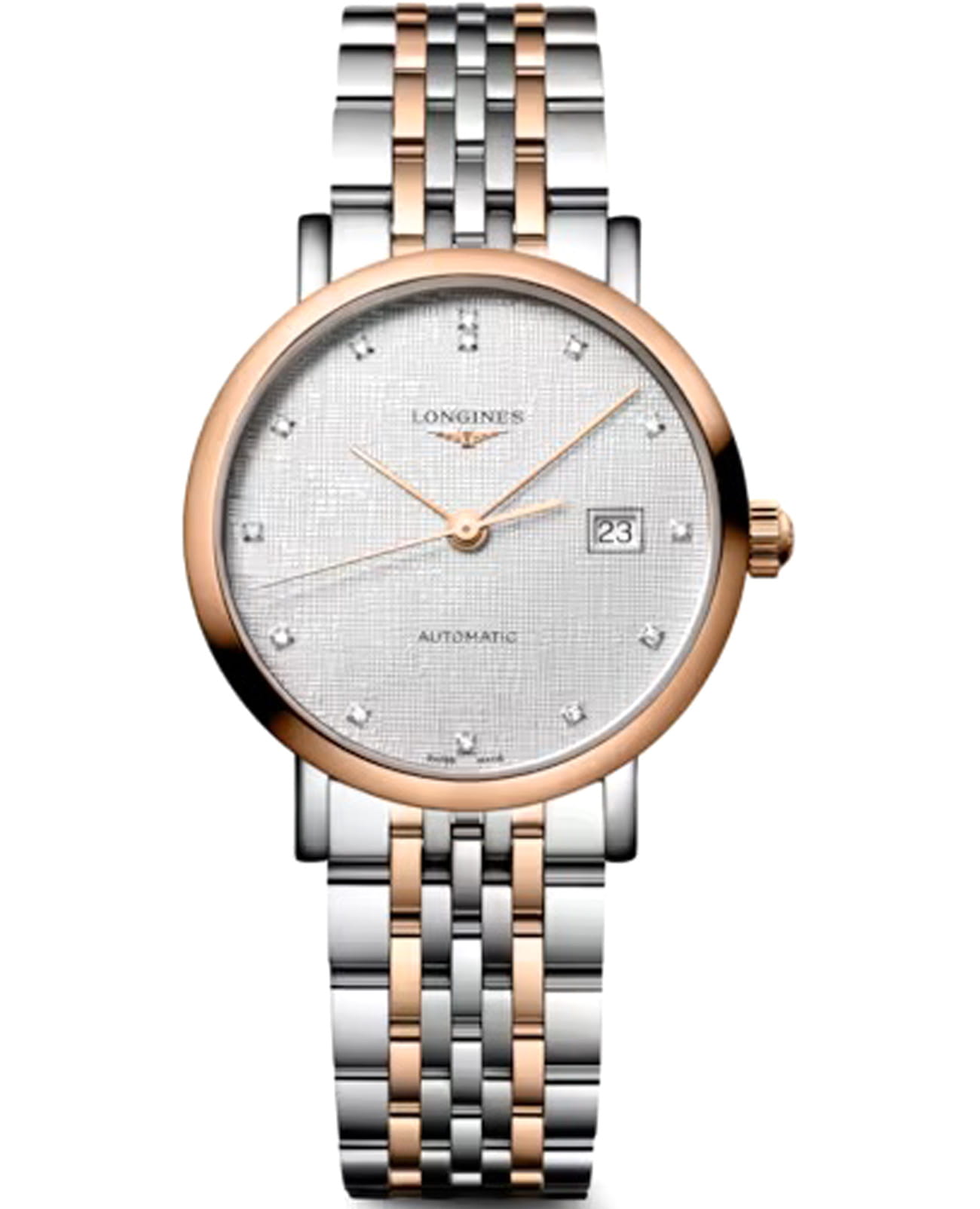 Изысканные женские часы Longines Elegant Collection  L4.310.5.79.7 — это воплощение спокойной роскоши и вечного стиля. Все элементы циферблата подчеркивают элегантность и классический вкус модели. Корпус часов изготовлен из нержавеющей стали, диаметром 29 мм. Защиту циферблата обеспечивает прочное сапфировое стеклоСапфировое стеклоПрочный и надёжный материал из кристалла сапфира синтетического происхождения, характеризующийся особой твёрдостью и устойчивостью к царапинам и повреждениям. с антибликовым покрытиемАнтибликовое покрытиеСлой оксида металла в 0,13-0,3 микрон, благодаря которому стекло часов не бликует и не отражает свет. Антибликовое покрытие уменьшает отражение света в 10 раз, обеспечивая отличную читаемость показателей циферблата. гарантирующее четкость показаний. Циферблат украшен 13 бриллиантами Top Wesselton VS-SI общим весом 0,029 карата. Неподвижный безельБезельВнешний ободок, закрепляющий стекло. В спортивных часах так называется поворотное кольцо с делениями на циферблате, выполняет роль таймера – замеряет отрезки времени на шкале. Неподвижный безель – элемент декора. Однонаправленно вращающийся безель на дайверских часах позволяет фиксировать моменты погружения и выныривания на поверхность. из 18-каратного золота18-каратное золотоОбозначение по каратной системе пробирования, оно показывает, сколько драгоценного металла содержится в изделии. 18 карат - в составе 75% чистого золота, соответствует 750 пробе.