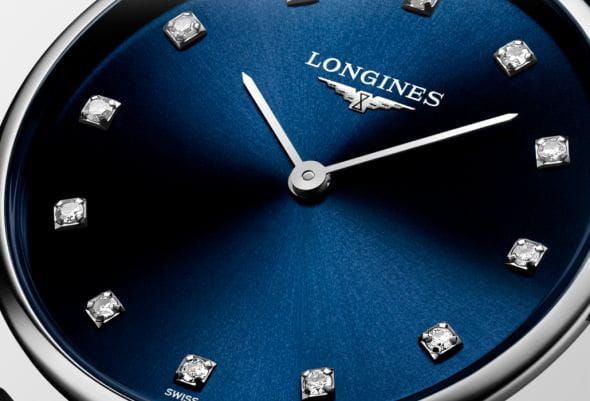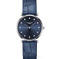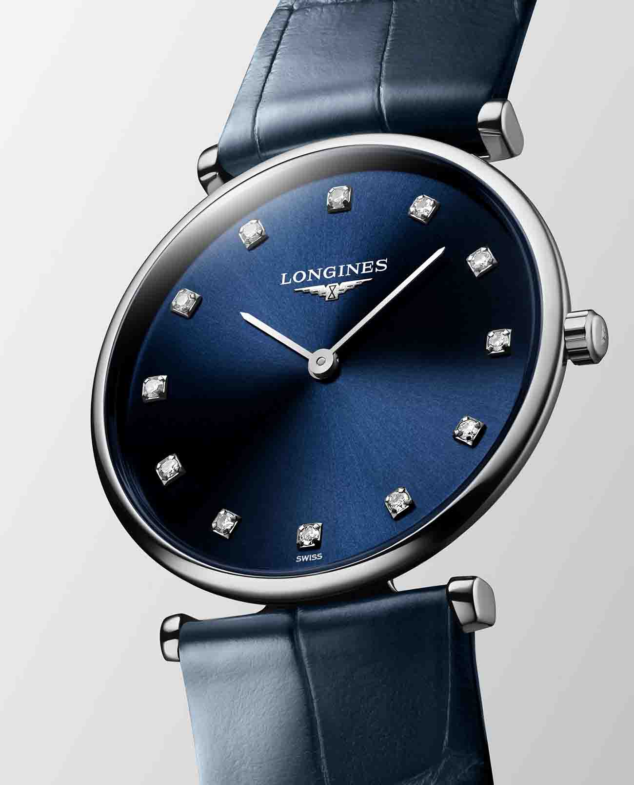 Компактный синий циферблат украшен 12 бриллиантами общим весом 0,081 карата. Элегантным дополнением стал ремешок из кожи аллигатора. Швейцарский кварцевый калибр L420 обеспечивает высокую точность хода. Сапфировое стекло не допускает появления царапин на поверхности.