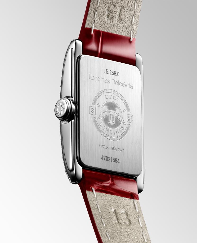 Женские швейцарские часы Longines DolceVita L5.258.0.71.5, кварцевый механизм с высокой точностью. Сапфировое стеклоСапфировое стеклоПрочный и надёжный материал из кристалла сапфира синтетического происхождения, характеризующийся особой твёрдостью и устойчивостью к царапинам и повреждениям. устойчивое к появлению царапин, обладающее высокой прозрачностью. Корпус часов изготовлен из нержавеющей стали с 36 бриллиантами группы Top Wesselton IF-VVS общим весом 0.280 карата. Метки в виде римских цифр. Класс водозащиты: 30 метров, позволит защитить корпус от случайных брызг или капель дождя. Ремешок из кожи аллигатора на стандартной застежке.