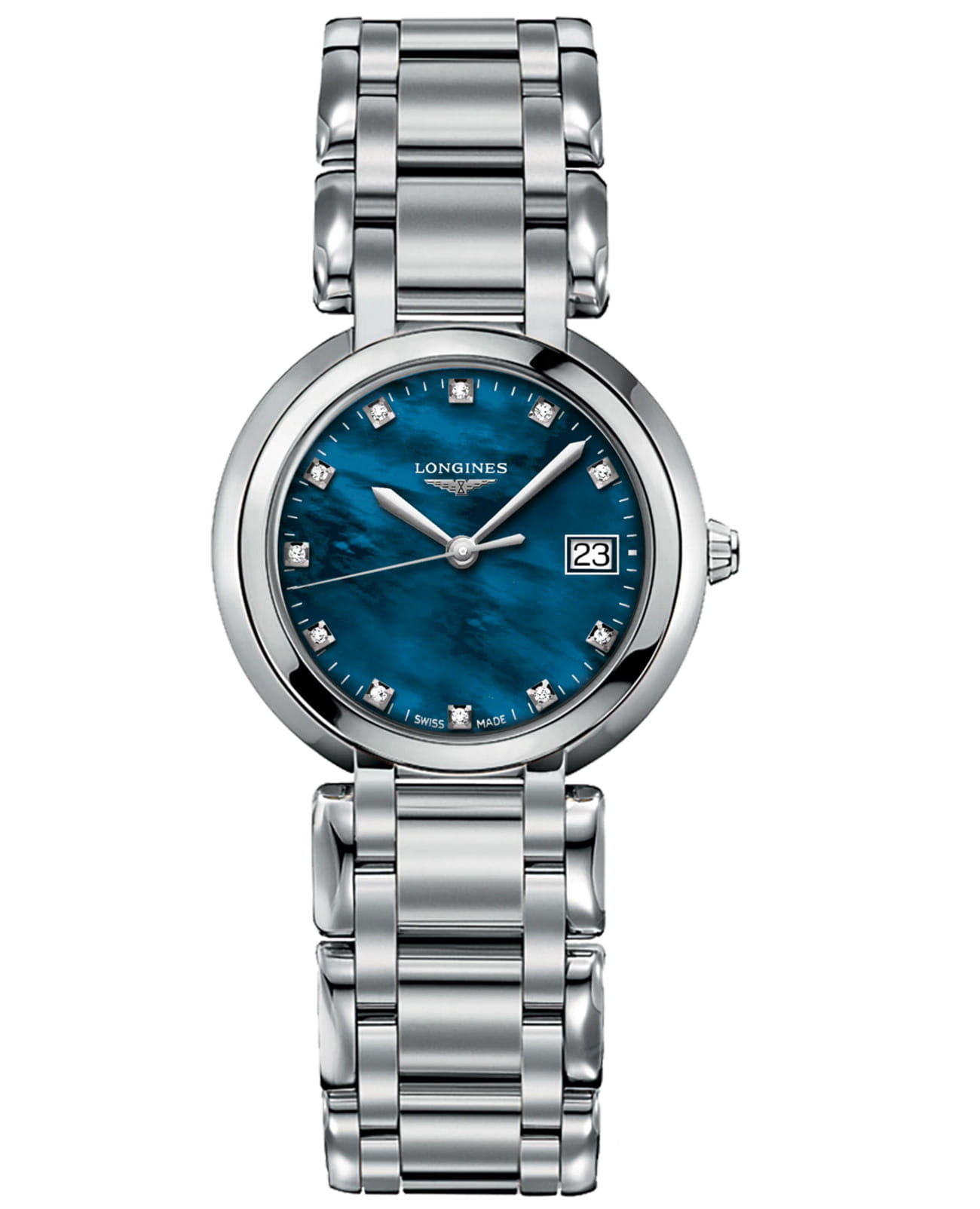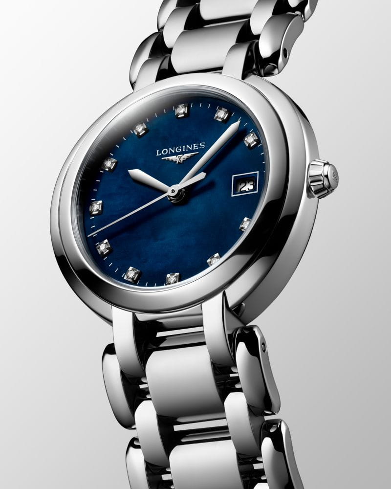 Изящная модель с синим перламутровым циферблатом украшена 11 бриллиантами группы Top Wesselton VS-SI общим весом 0.044 карата. Швейцарский кварцевый калибр L129 обеспечивает высокую точность хода. Сапфировое стекло устойчиво к царапинам и имеет антибликовое покрытиеАнтибликовое покрытиеСлой оксида металла в 0,13-0,3 микрон, благодаря которому стекло часов не бликует и не отражает свет. Антибликовое покрытие уменьшает отражение света в 10 раз, обеспечивая отличную читаемость показателей циферблата.. Наручные часы оснащены индикатором EOLEOLПредставляет собой систему, уведомляющую владельца часов о необходимости замены элемента питания. За 2 недели до полного разряда батарейки секундная стрелка перестаёт ходить чётко и начинает перепрыгивать на 3-4 деления..
